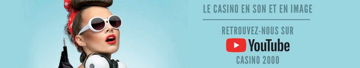 Établissement réservé aux personnes majeures munies d’une pièce d’identité Les infos pratiques Rue Théodore Flammang - L-5618 Mondorf-les-Bains Tél. : (+352) 23 611 - 213 - Fax: (+352) 23 611-229 info@casino2000.lu - www.casino2000.lu - Parking gratuit LES CHIFFRES À PROPOS DU CASINO CASINO 2OOO C’EST ... 1 espace casino 3 restaurants 2 hôtels 1 salle de concerts & spectacles 2 espaces de réception ... MAIS AUSSI 520.000 visiteurs par an 210 collaborateurs 10.000 m2 de divertissements 200 concerts & spectacles par an CASINO L’Espace Machines à Sous est ouvert tous les jours dès 10h00