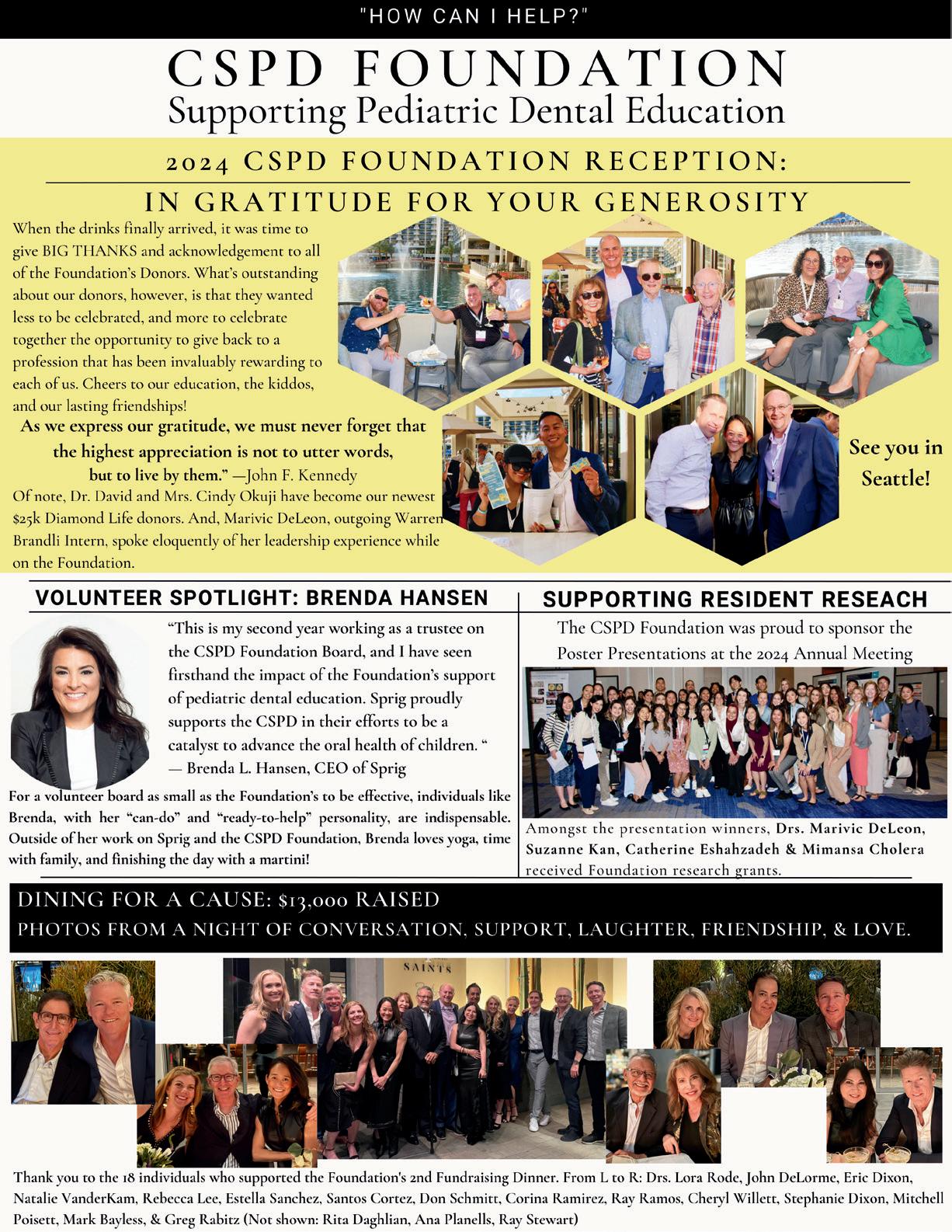 The CSPD had another very successful Annual Meeting at the JW Marriott. The weather was outstanding, the quality of the continuing education and the time with friends were even better. At the Installation luncheon, our guest speakers included CDA President Carliza Marcos, AAPD President-Elect Scott Smith, and WSPD President Felicity Hardwick. Current AAPD President Scott Cashion was in the audience, and we were even able to sing happy birthday to the AAPD CEO John Rutkauskas. The high level of leaders in organized dentistry we host at our annual meeting is a testament to the reputation of the CSPD and the quality of the meeting our society creates.
