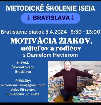 V Bratislave organizovala dňa 5. apríla 2024 asociácia ISEIA - International Slovak Educational Institution and Association metodické školenie pre učiteľky slovenčiny vyučujúce v centrácha a školách v zahraničí. Školenie na tému Motivácia žiakov, učiteľov a rodičov viedol Daniel Hevier. Školenie sa uskutočnilo v priestoroch NIVAM - Národný inštitút vzdelávania a mládeže. Zúčastnili sa ho riaditeľky a učiteľky zo slovenských vzdelávacích centier a škôl z Anglicka (Birmingham, Bristol, Warwick), Nemecka (Mníchov), Rakúsko (Viedeň) Srbska (Belehrad), Švajčiarska (Zürich), Talianska (Miláno) a Slovensko (Martin).