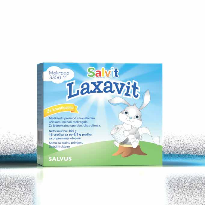 Salvit Laxavit je medicinski proizvod na bazi Makrogola 3350, koristi se u slučajevima kronične konstipacije i neredovitog pražnjenja crijeva. Zahvaljujući osmotskom učinku Makrogola 3350, koji ima visoki afinitet vezanja vode i omekšavanja stolice, ubrzava rad i olakšava pražnjenje crijeva na prirodan način. Ne apsorbira se niti metabolizira u crijevima, ne fermentira u crijevima, ne iritira sluznicu te se eliminira stolicom u neizmijenjenom obliku. Može se koristiti već od 6 mjeseci života. Odličnog je okusa citrusa.
