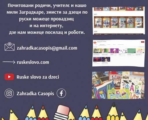 Друкуєдрукарня: „MAXIMAGRAF”, Петроварадин YU ISSN 0353-9938 Е-mail: zahradkacasopis@gmail.com Web site: www.ruskeslovo.com → Заградка YouTube: Ruske slovo za dzeci Илустрациї: АлександраМедєши