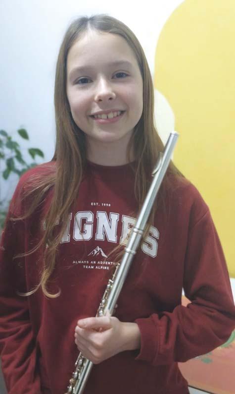яки то флаута инструмент. – То як длугша палїчка, хтора ма клапни и до нєй ше дує. Поведла бим же флаута як даяки кральовски, отмени инструмент, ма фини звук, нїжна є и високо грає. Початок ми бул чежши, бо сом у другей и трецей класи пре корону ходзела онлайн. На перших год зинох сом найбаржей учела як правилно ди хац. Єст вежби хтори нам помагаю же бизме то лєпше робели – потолковала нам Мартина же флаута спада до дуйних инструментох, та прето барз важне мац добри плюца. Волї грац швидки и длугоки композициї, як тоти цо иду помали, а на годзини флаути барз люби ходзиц, док на солфедьо, гвари, дакус менєй. – Два раз тижньово мам флауту, два раз солфедьо и раз оркестер. Кажди дзень и дома вежбам грац. Мой тато грає на кларинету 6 Мартина Фейди зоз Нового Саду ОТМЕНИ И НЇЖНИ ЗВУКИ ФЛАУТИ
