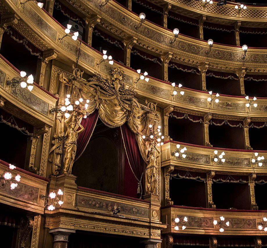 Infatti il Palco Bellini sfoggia sulle sue pareti fotografie autografate dei protago nisti del circolo Bellini, uno dei circoli nobiliari più antichi d’Europa. La Sala Pompeiana del Teatro è di forma cir colare, decorata da soffitti affrescati e progettata seguendo un ordine con pro tagonista il numero sette e i suoi mul tipli: straordinario l’effetto d’eco che si produce, che aumenta con l’avvicinarsi al centro della stanza. Infine nella Sala Grande il soffitto è decorato dalla Ruota simbolica, composta da undici tele raffi guranti il Trionfo della Musica che gra zie ad un sistema di funi, si può aprire verso l’alto per far defluire l’aria calda e ventilare la sala.