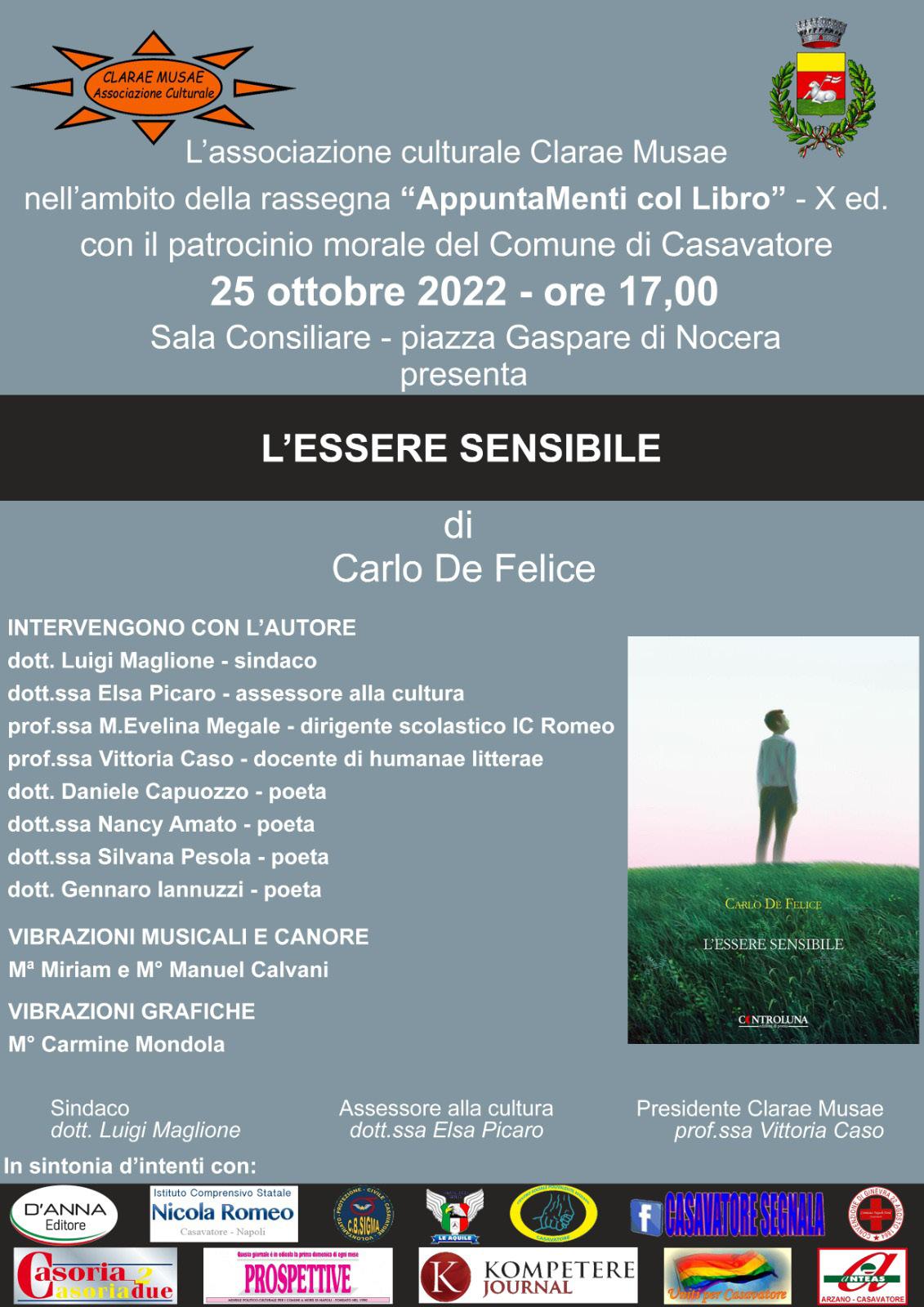 Il 25 ottobre, dunque, sarà presentata la silloge poetica “L’es sere sensibile” di Carlo De Felice Vespasiano, giovane citta dino di Casavatore, il quale ha espresso emozioni e sentimenti personali, riflessioni e osservazioni sull’attuale realtà in com ponimenti incisivi e toccanti. I versi di Carlo, che sono stati presentati più volte in Campania dalla casa editrice Controluna, nonostante la pandemia, è giusto e opportuno che siano presentati anche nella città natale del giovane autore. “Clarae Musae non ha una sede, né ha fondi – ha affermato la prof.ssa Caso, che in base alle sue accreditate esperienze cultu rali si diletta a organizzare incontri letterari, reading, concorsi – pertanto, chiede ospitalità innanzitutto ai comuni, in quanto ritiene che tra i bisogni dei cittadini, che le amministrazioni hanno il compito di soddisfare, ci sia anche e soprattutto il bisogno di cultura. La cultura fa crescere cuore e mente, aiuta a comprendere i confini tra legalità e illegalità, a superare la logica clientelare del do ut des, è un elemento indispensabile per elevare i territori delle nostre periferie e renderli competi tivi; ma laddove dei privati, com’è stato per alcuni anni per la Libreria D’Anna siano disponibili ad ospitare eventi culturali, in men che non si dica sarò ben lieta di organizzare un evento. In questo caso, devo ringraziare l’amministrazione Maglione, nelle persone del Sindaco Luigi Maglione e dell’Assessore P.I. e cultura Elsa Picaro, che hanno reso disponibile con il patrocinio morale il ritorno nella sala consiliare degli Appun taMenti col Libro. Sono sempre disponibile a dare il mio con tributo quando si tratta di cultura!”.