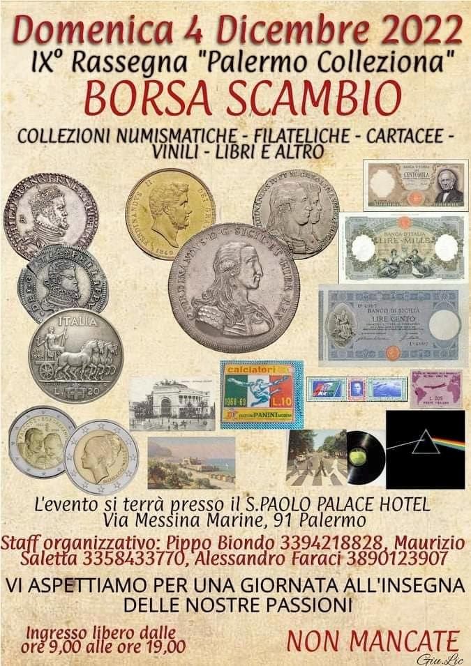 Buongiorno e buona domenica amici letto ri, a Palermo, il 4 dicembre si terrà nella sala Orione del San Paolo Palace Hotel la IX Rassegna “Palermo Colleziona” Borsa Scambio a Palermo, in via Messina Marine, 91 un evento che farà la gioia di tutti gli appassionati collezionisti. Grazie allo staff organizzativo: Pippo Biondo, Maurizio Sa letta e Alessandro Faraci, che fin dalla pri ma edizione hanno curato questa mostra nei minimi dettagli.