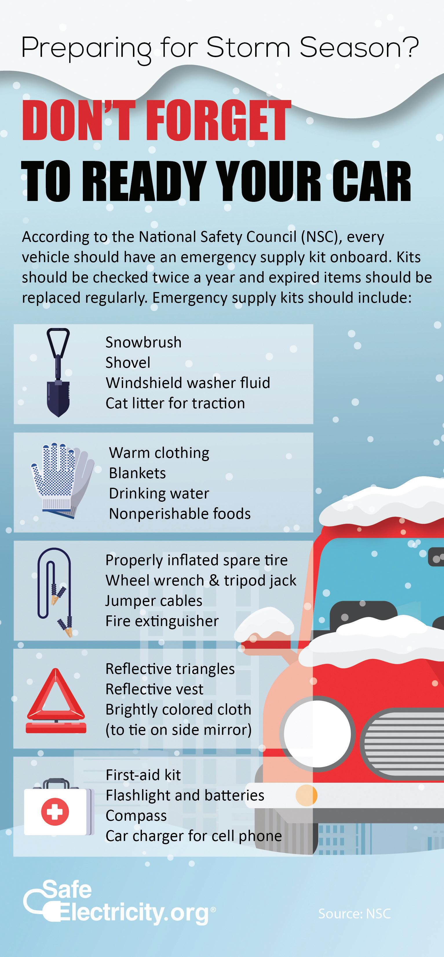 Pack an emergency kit - check out the graphic for details. Complete annual maintenance, test the car battery and cooling system, use winter tires and replace them if the tread is less than 2/32 of an inch, check tire pressure and wiper blades, add wiper fluid rated for less than minus 30 degrees and keep the gas tank at least half full.
