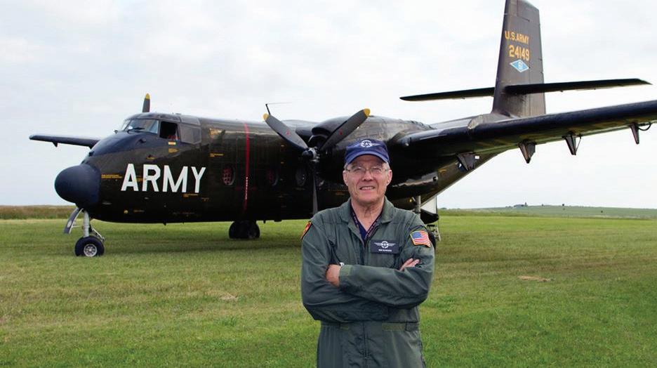 “You can see I was a grease monkey,” Schrader laughed, pointing to a portrait of his younger self in his aircraft maintenance uniform, standing alongside the tail end of a U.S. Army twin-engine Caribou transport plane. “They needed 14 people trained on multi-engine for the brand-new Caribou, so the top 14 people got the position. I was number 14. I just made it.”
