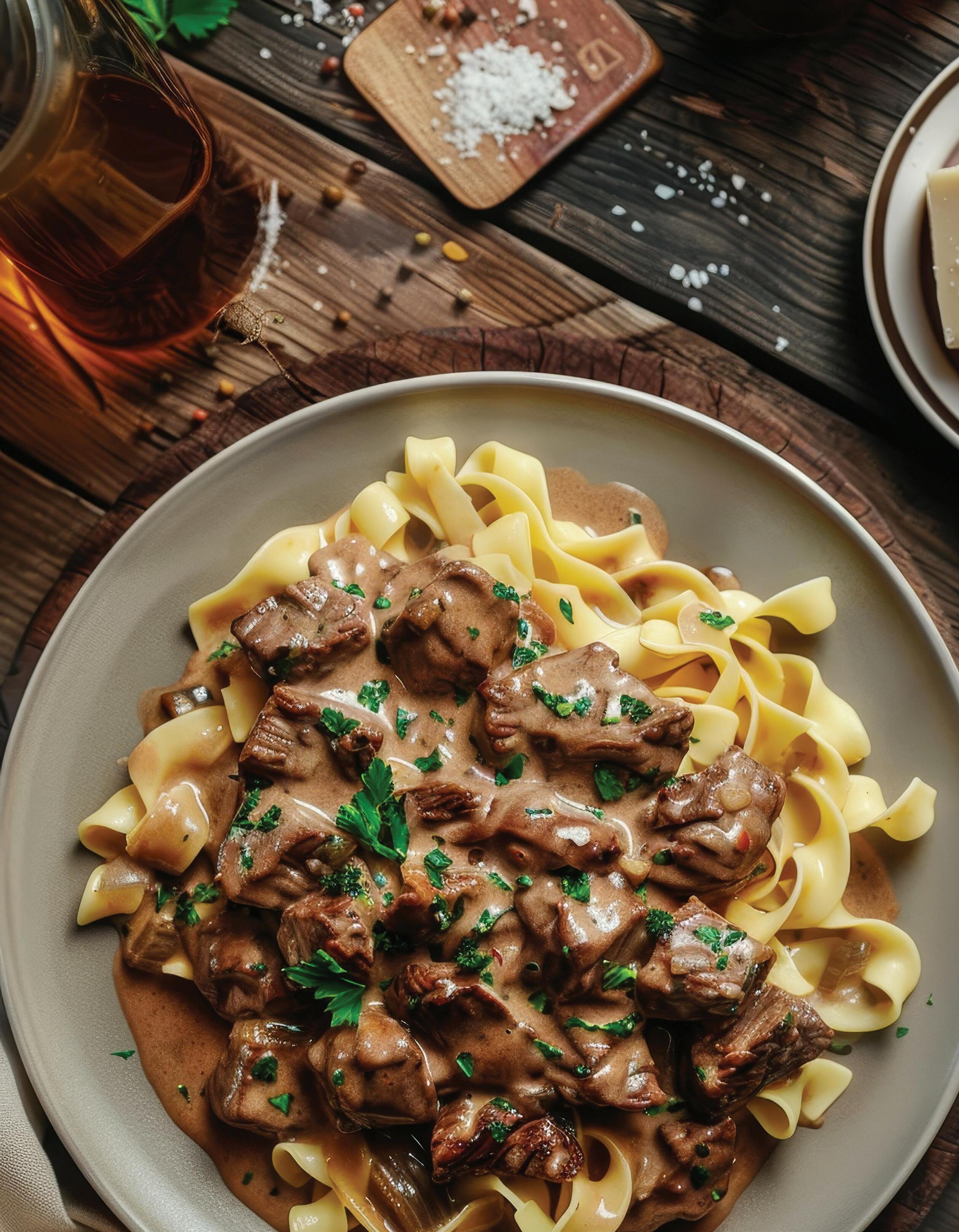 Put beef, onion, soups, mushrooms, and pepper in a slow cooker, cover, and cook on low heat for at least 8 hours. Stir cream cheese into beef mixture until melted. Stir in sour cream. Serve beef mixture over egg noodles.
