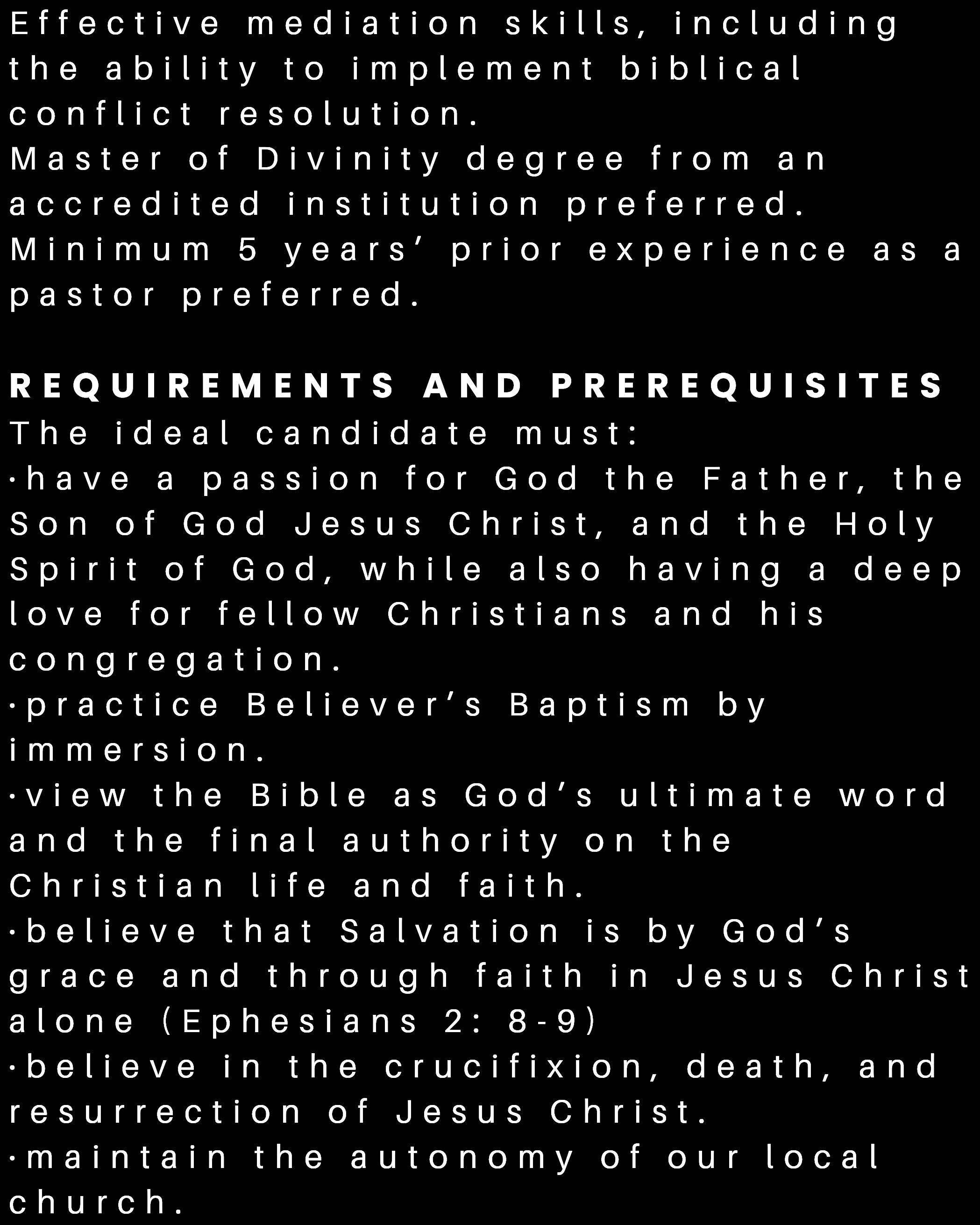 We believe in the unity of all true believers in the universal Church, which is the body of Christ and was formed by Christ through His Apostles. All believers, from Pentecost to the Rapture, both Jews and Gentiles, are added to this Church when they believe the Gospel and are spiritually immersed into Christ’s body (Acts 2:41–42; 1 Corinthians 11:2; 12:12–13; Ephesians 3:1–6). The universal Church is revealed through local congregations of redeemed, baptized believers who commit to one another in their covenant of faith and fellowship of the Gospel. The Church observes the ordinances of Christ, is governed by His laws, and exercises the gifts, rights and privileges invested in them by His Word. The biblically designated offices are elders (also called bishops, pastors, and pastor-teachers) and deacons, whose qualifications and duties are revealed in the scriptural accounts of the early Church. The true mission of the Church is the faithful witnessing of Christ to all as we have opportunity. The local church has the absolute right of self-government free from the interference of any hierarchy of individuals or organizations. The one and only superintendent is Christ through the Holy Spirit. It is scriptural for biblical churches to cooperate with each other in contending for the faith and for the furtherance of the Gospel. Each local church is the sole judge of the measure and method of its cooperation.