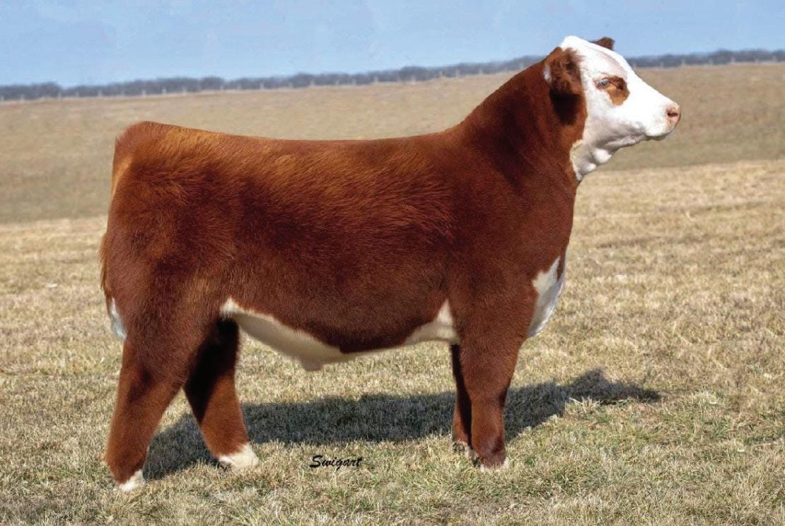 A fall “GOLD RUSH” heifer calf that is double red eyed, dark red, and is loaded with performance. Excellent EPD profile - SCF 1%, BMI 1%, and CHB top 4%. OCV. Consigned by Greives Herefords.