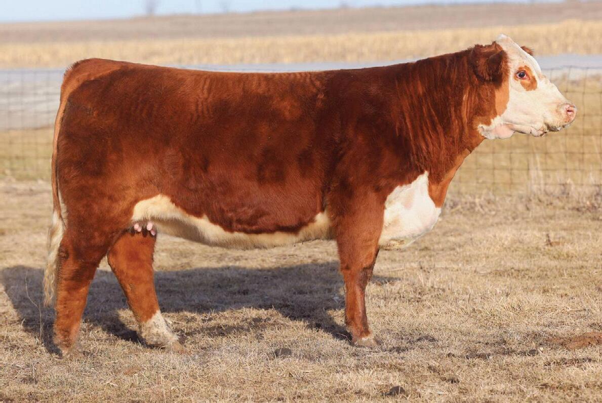 This is a stout-made, freckled-faced, good-uddered daughter of Churchill Nightcap. Her EPD profile is very unique in that all six maternal traits are in the top 36%, C.E. top 11%, MARB top 3%, and CHB top 10%. Actual production record B.W. 4 @ 95.6 and W.W 3 @ 112.7. First son was tested at IBEP bull test - IMF 131.0. Bred A.I. to CMF 1720 Gold Rush 569G ET on 11-15-2024. Checked safe to A.I. date with a bull calf pregnancy. Expected due date 8/24/2025. Consigned by Greives Herefords.