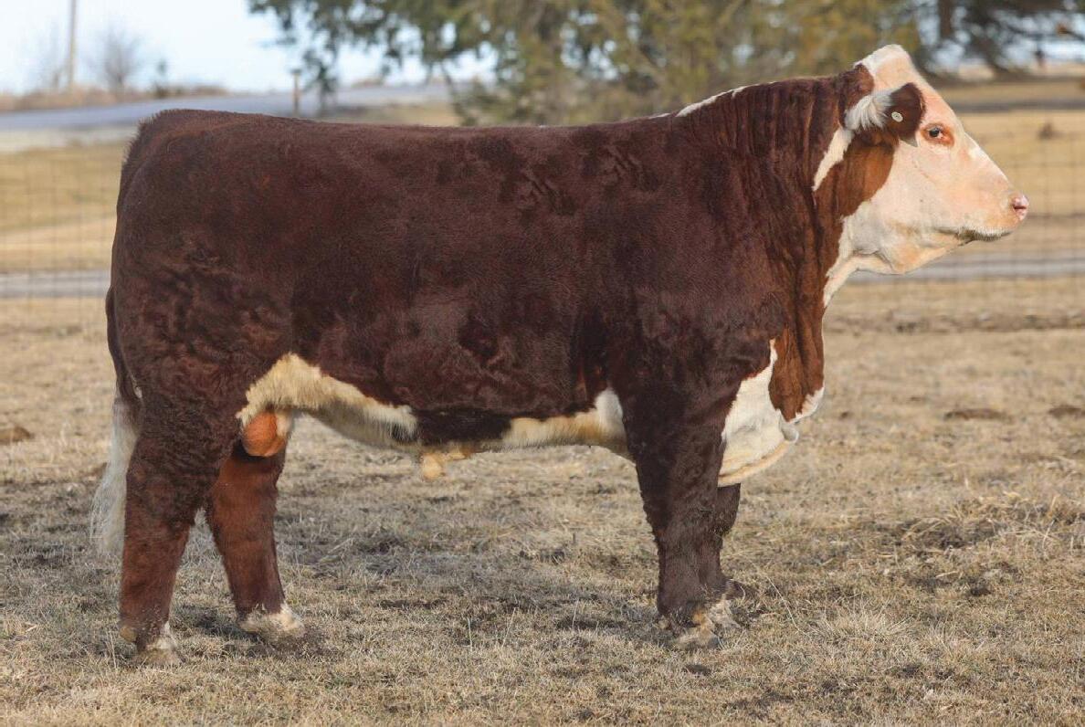 Catalyst is deep, dark red and pigmented. He has good muscle shape, thickness and is structurally sound and nice-fronted. Heifer safe. He is the service sire for our bred heifer lot in this sale. His dam is a good uddered Hometown daughter and one of our best. Consigned by Paul Polled Herefords.
