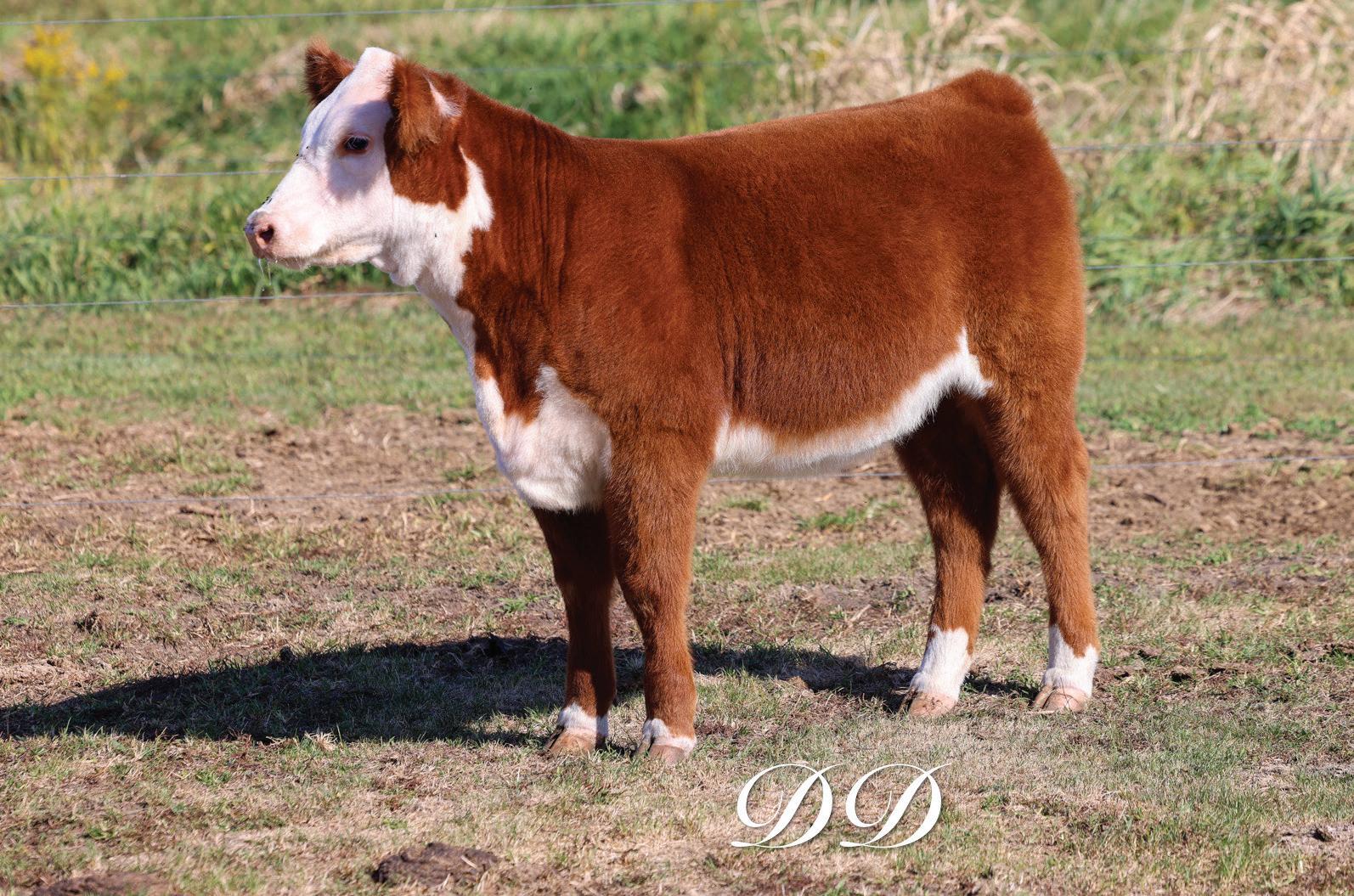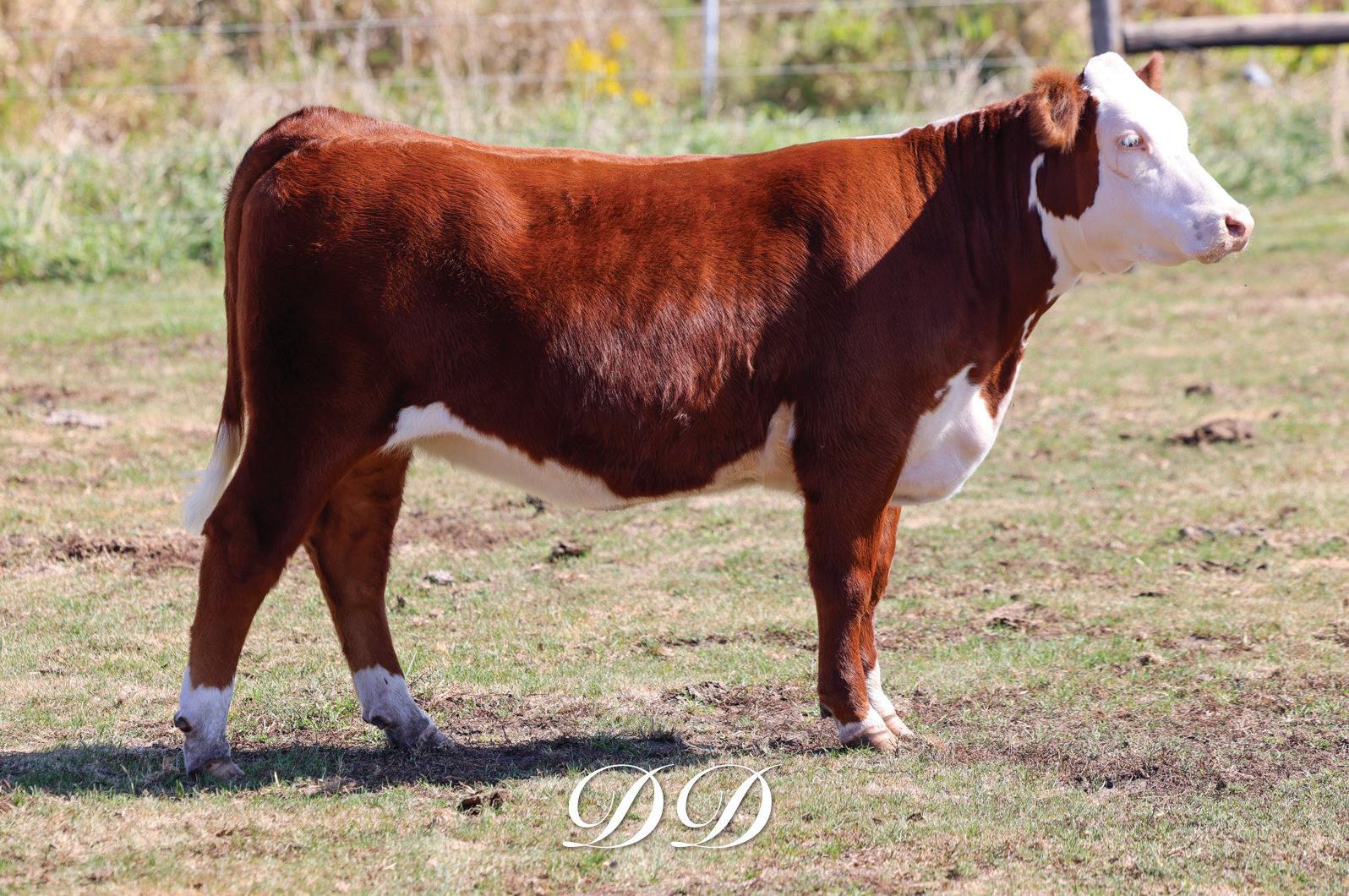 Adrian is a modern day Hereford breeder’s dream. Perfect udder, full pigment, great running gear, desirable phenotype, and an impressive EPD profile. We ask our cows to do a lot, and Adrian is one that flat gets it done. Her dam and grandam both are former Heart of America Sale highlights, now in production at Goldstein Farms. Bred AI on 6/3/25 to HUTH CLC WF Deluxe K016. Pasture exposed to GGSC MGS Ladies Man H09 ET (Full Brother to Montgomery) from 6/11/25 - 9/20/25.Consigned by Benedict Herefords - Noah Benedict, 605 CR 2300 N Dewey, IL 61840, 217-372-8009.