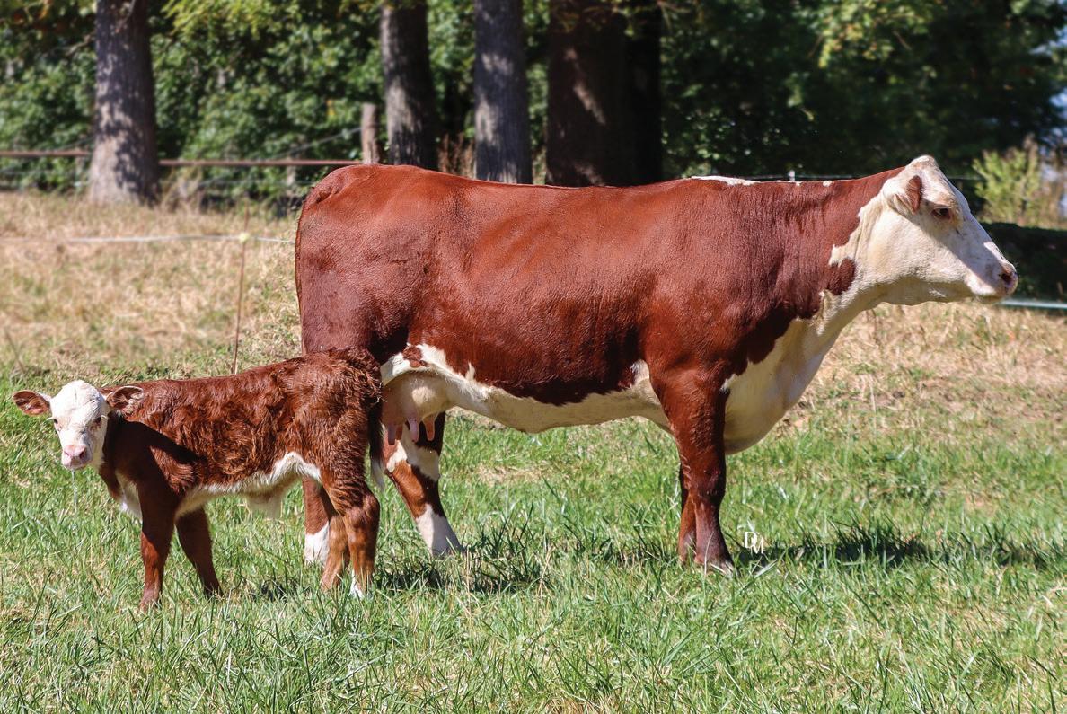 A two-year-old Sierra daughter, has that extra eye pigment, dark color and excellent EPD profile. She raised a nice replacement heifer, as could be predicted. Sierra daughter - 25 calves, 104.1 average WR. Sierra is an 11 trait sire leader and was tested through the NRSP. Bred to GG MERIT 405 on 6-16-25, due 3-2526 with a heifer calf pregnancy. Consigned by Greives Herefords - Bob Greives, 7591 Armstrong Chapel Rd., West Lafayette, IN 47906, 765-491-6277.