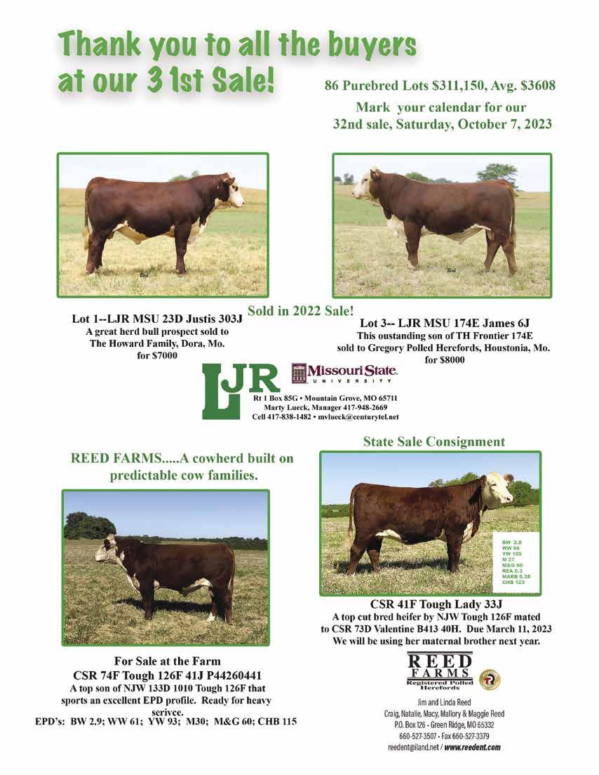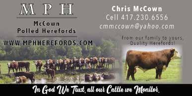 WWW.MOHEREFORDS.ORG • LIKE US ON FACEBOOK SPONSORED BY THE MISSOURI HEREFORD ASSOCIATION Missouri Opportunity Sale Sunday, December 4, 2022 • MSF Fairgrounds in Sedalia, Mo • Noon CTS BULLS • SPRING PAIR SPLITS • FALL PAIRS • SPRING BRED HEIFERS FALL OPEN HEIFERS • SHOW HEIFER PROSPECTS • EMBRYOS OFFERING OVER 70 LOTS MATT REYNOLDS • SECRETARY/ TREASURER • 660.676.3788 • REYNOLDSCATTLE@CVALLEY.NET ANNUAL MEMBERSHIP MEETING & AWARDS BANQUET 5 P.M. DECEMBER 3, 2022 AH JDH MUNSON 15E BRED HEIFER BRED TO CMF 3005 EPIC 384E CRR 719 CATAPULT 109 BRED HEIFER BRED TO CHURCHILL MAJESTIC 903G 7 YEAR OLD FALL CALVING COW BY NJW 73S W18 HOMETOWN 10Y SPRING HEIFER CALF BY FINAL TEST SELLS OPEN 4 YEAR OLD FALL CALVING COW BY THA 4R FLAGG J503 SPRING HEIFER CALF BY CRR 719 CATAPULT 109 • SELLS OPEN 9