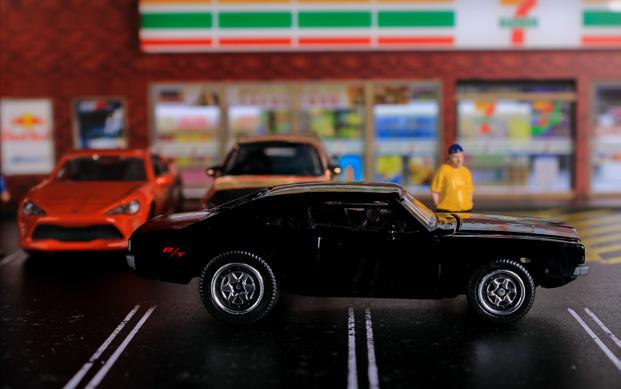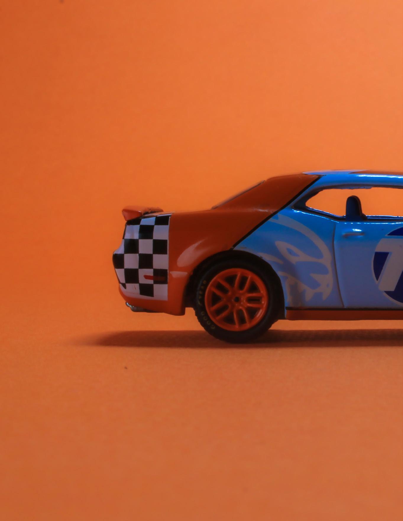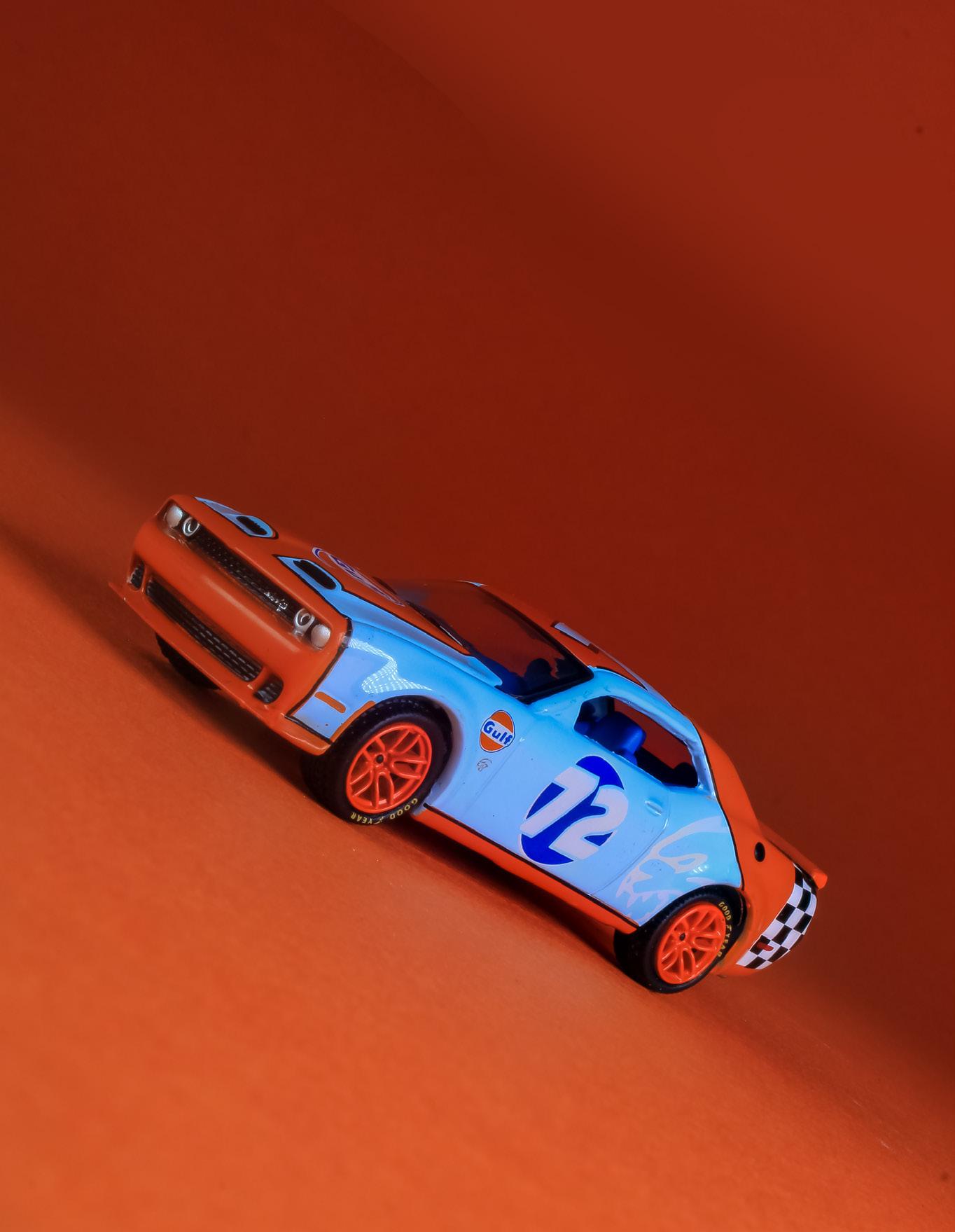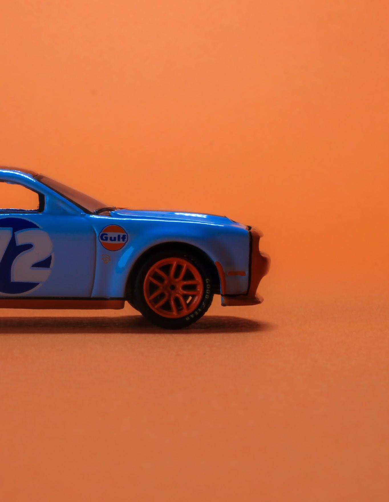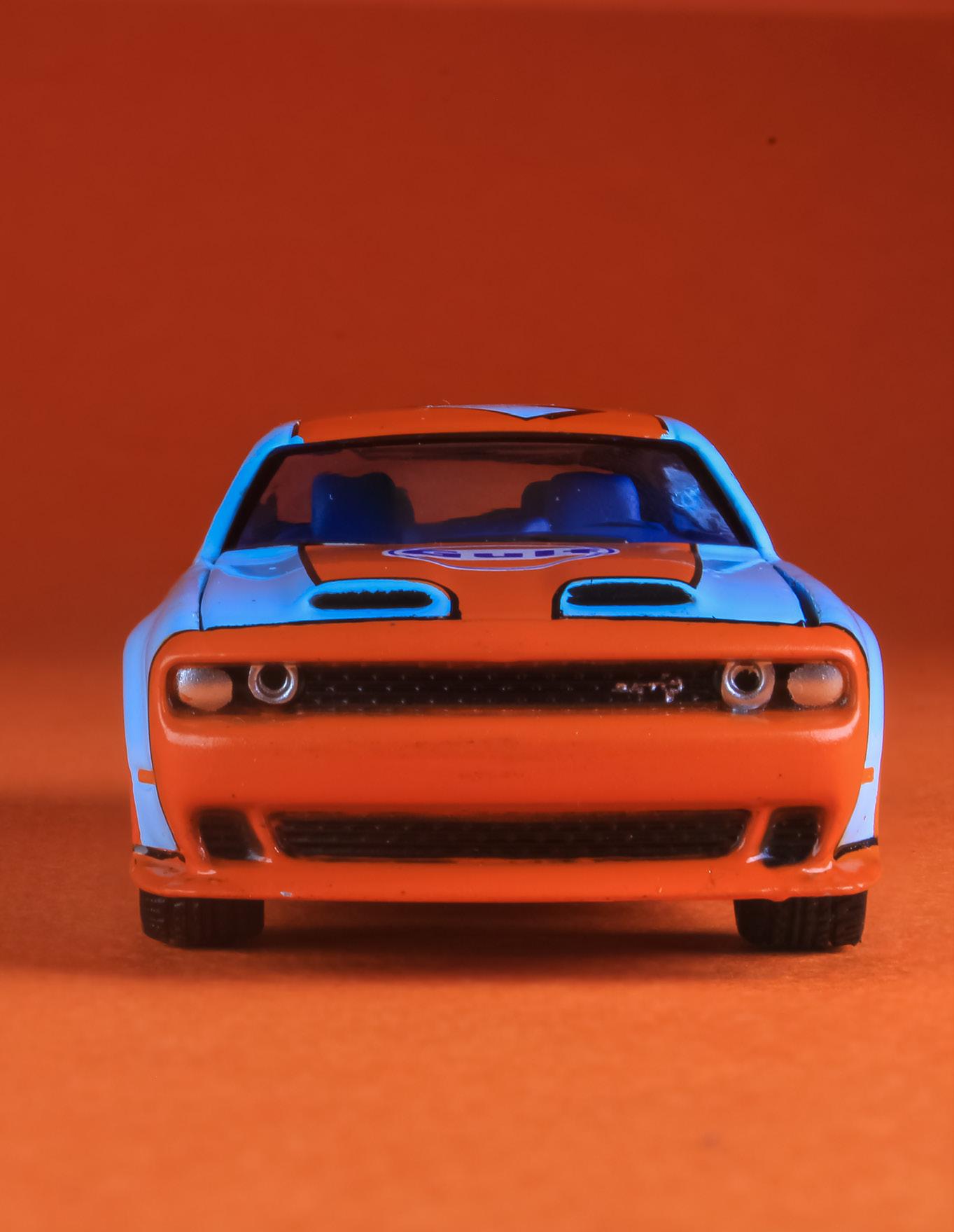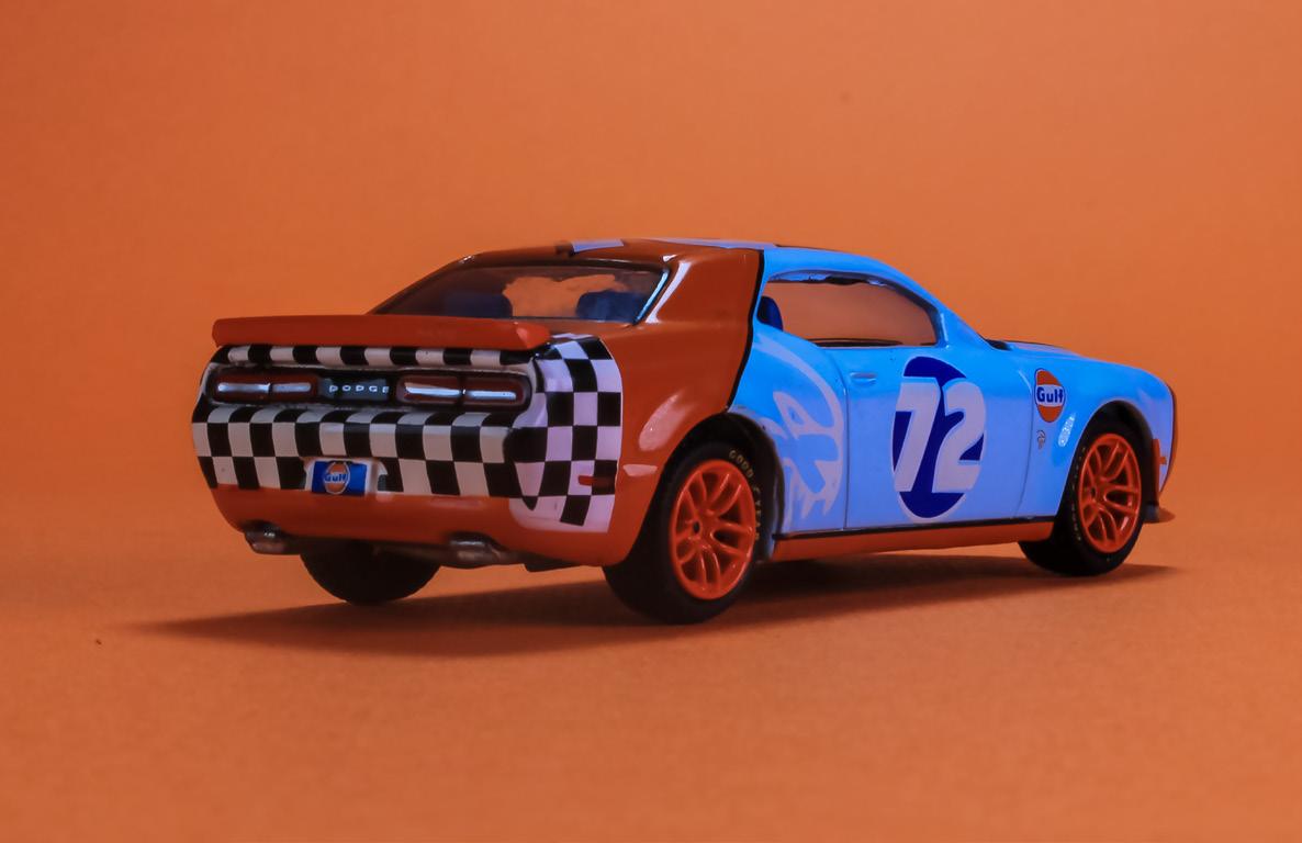 Rubber wheels on bright orange rims with Goodyear branding in yellow sits under the Gulf Liveried Hellcat with its Chequered rear bright orange and GULF Blue paintwork makes it a very striking car to look at. Though they are made of plastic the rims are precision cut and quite articulate in design giving the car a premium look even though the lights are painted though you would hardly notice it. What is noticeable is the air intakes for the supercharger next to the headlights we thought those were really cool. One last feature we didn’t notice till the time of writing this article was the hood opens to reveal a painted engine. It is a basic plastic mold but because its painted blue and orange it would make a great garage diorama car.