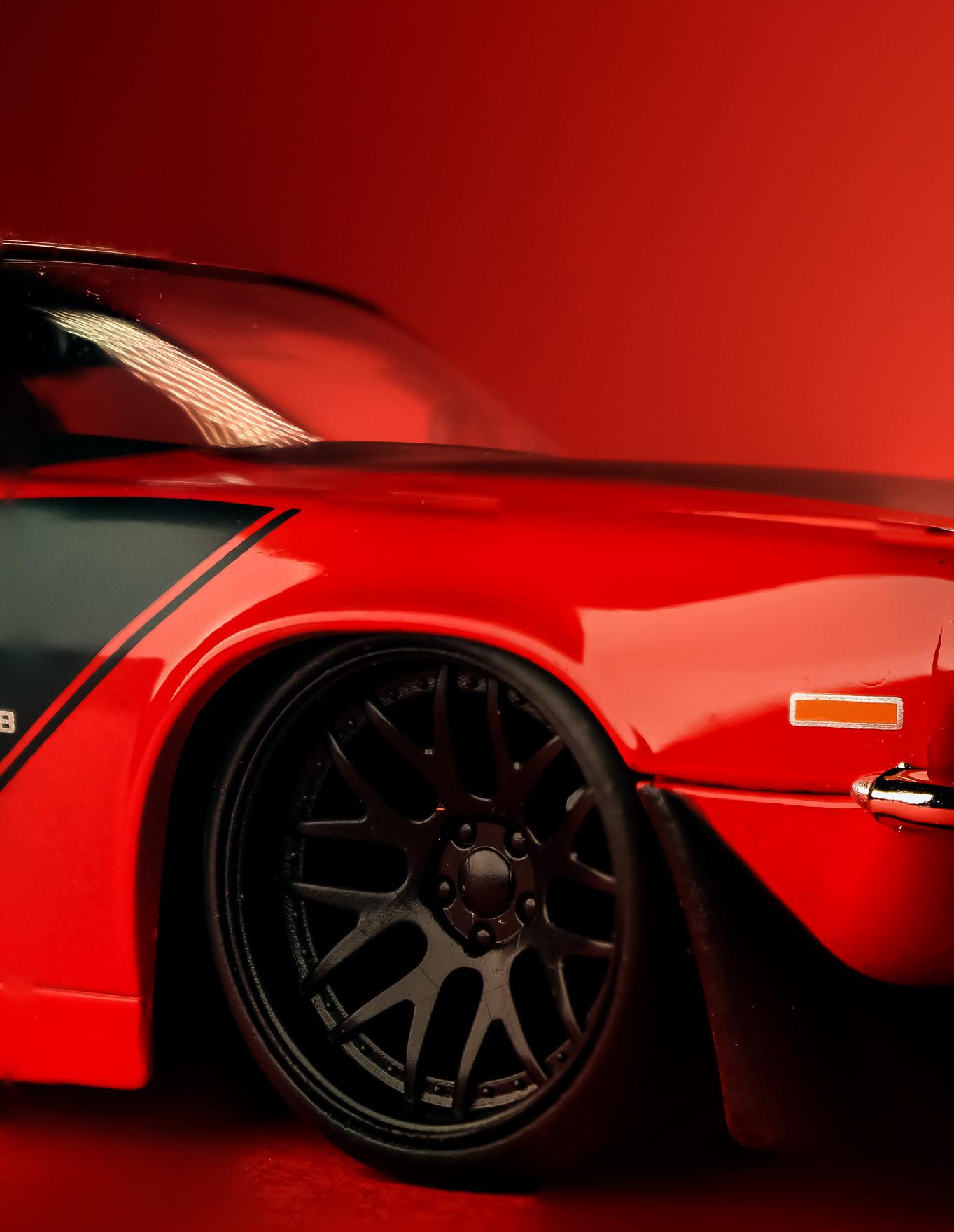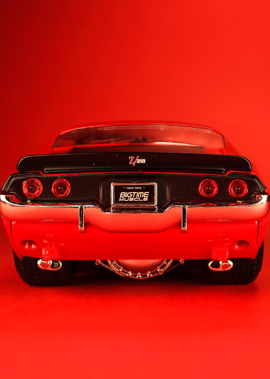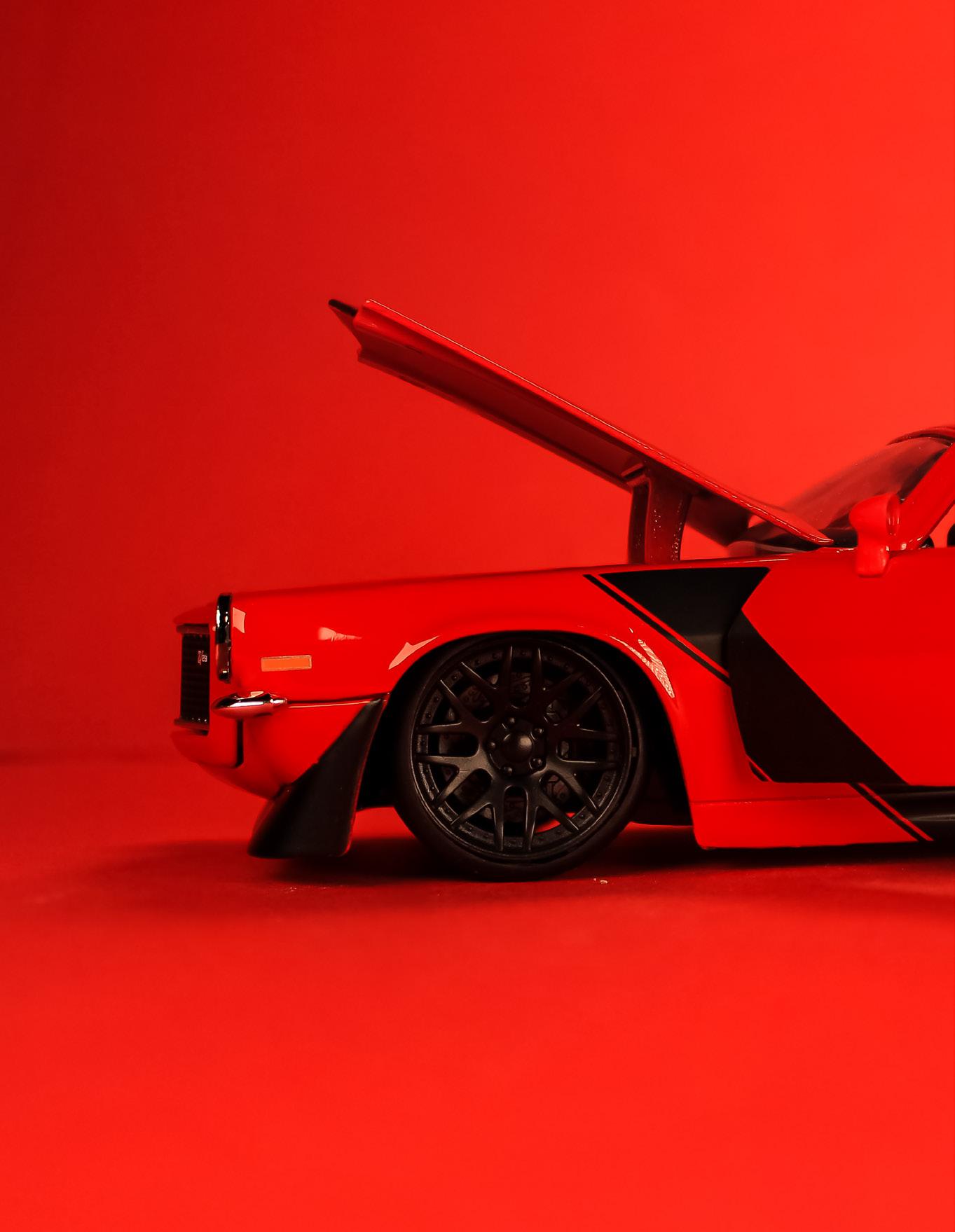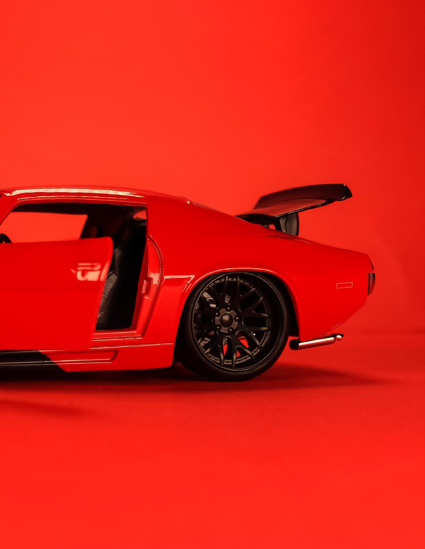 An angry car built to fly like a torpedo with massive rear wheels to handle otherwise rubber destructive torque draped in the color of fury save for double black lines of the 70’s and 80’s ‘go fast’ fashion. JADA has really improved on the external looks of their models, almost poetic.
