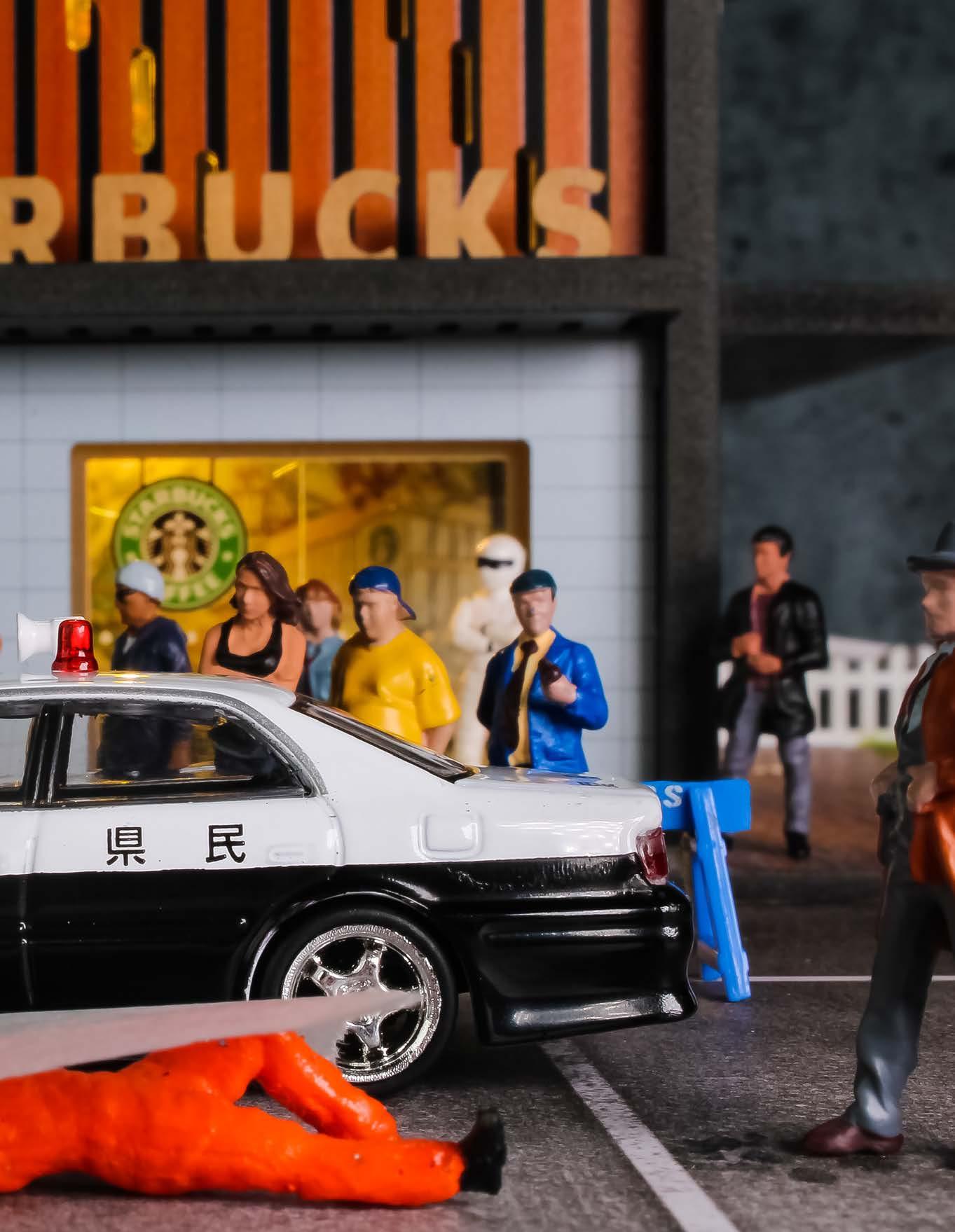 Not at all. Much simpler. A Toyota Chaser Japanese Police Car with a siren horn on the top and VERTEX BODY KIT rolled up to the local district’s Starbucks and Roger who was leaning over a signboard admiring the car suddenly heard the sickening crack of plastic breaking and fell to his demise. But as his body was cleared away you can see the reason why he was unable to resist a prolonged look that ultimately ended his life.