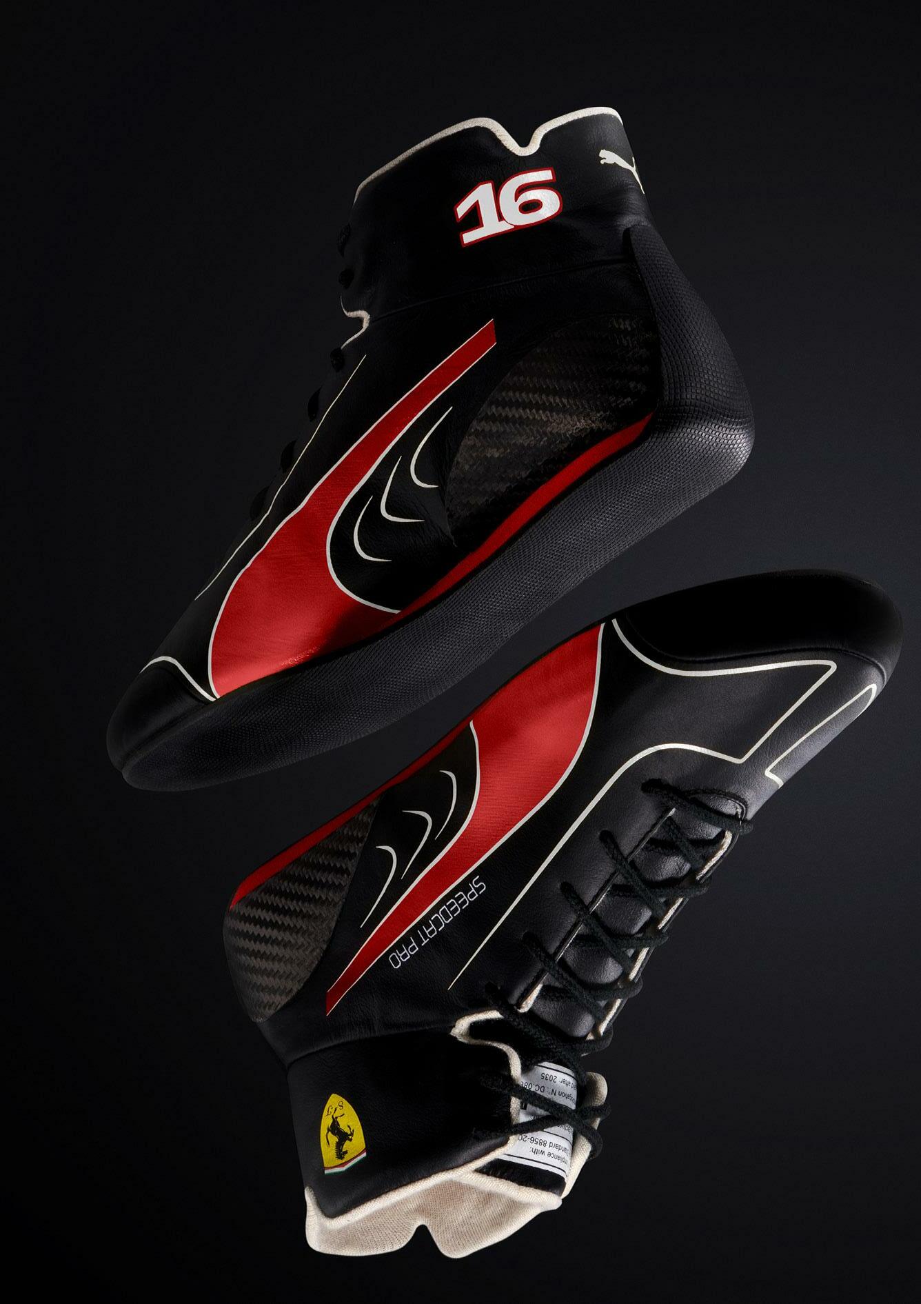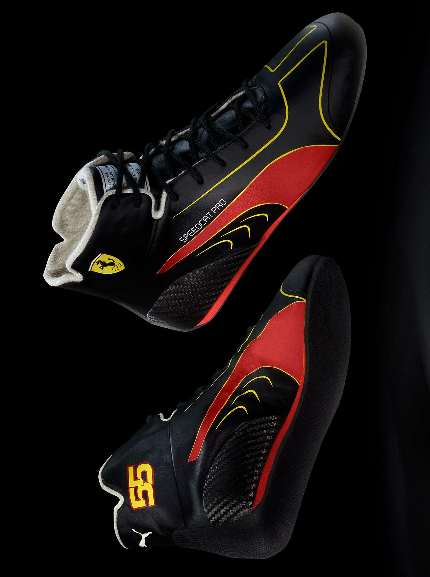 Colored in black with distinctive red PUMA branding and yellow accents for the Carlos Sainz Edition and white accents for the Charles Leclerc Edition , the Scuderia Ferrari Speedcat Pro Replica Edition also proudly displays the famous Ferrari Cavallino shield, as well as the race numbers 16 and 55 belonging to Charles and Carlos.