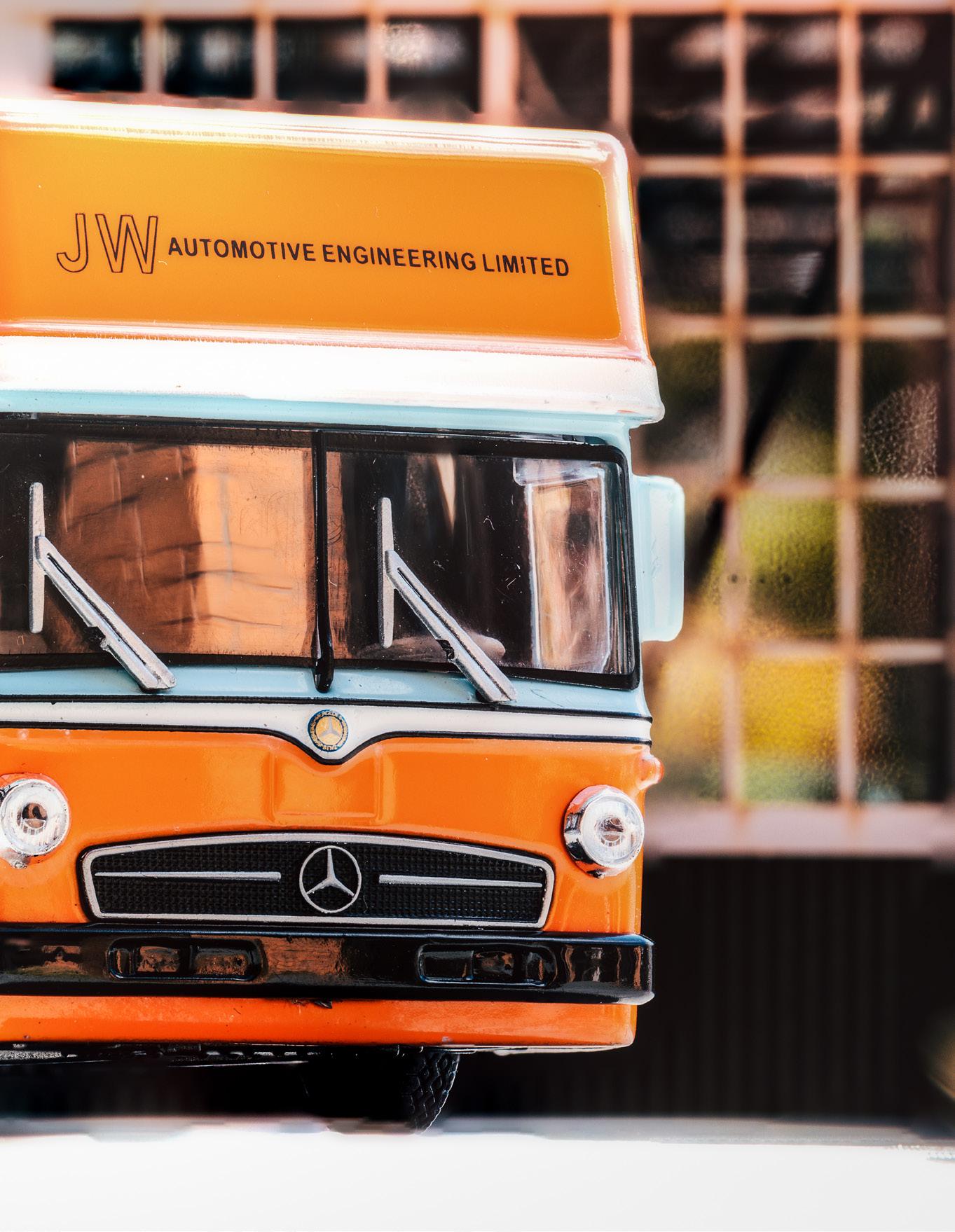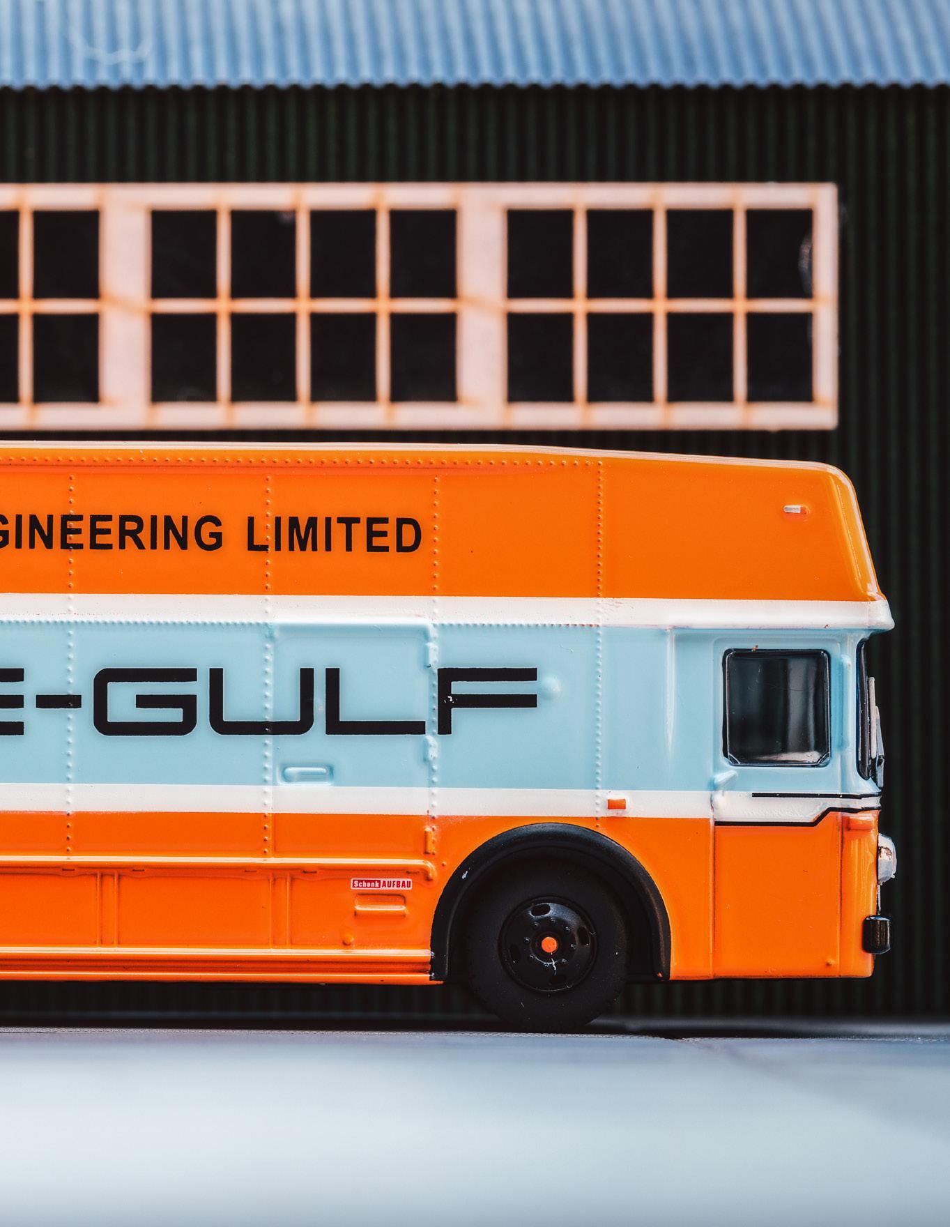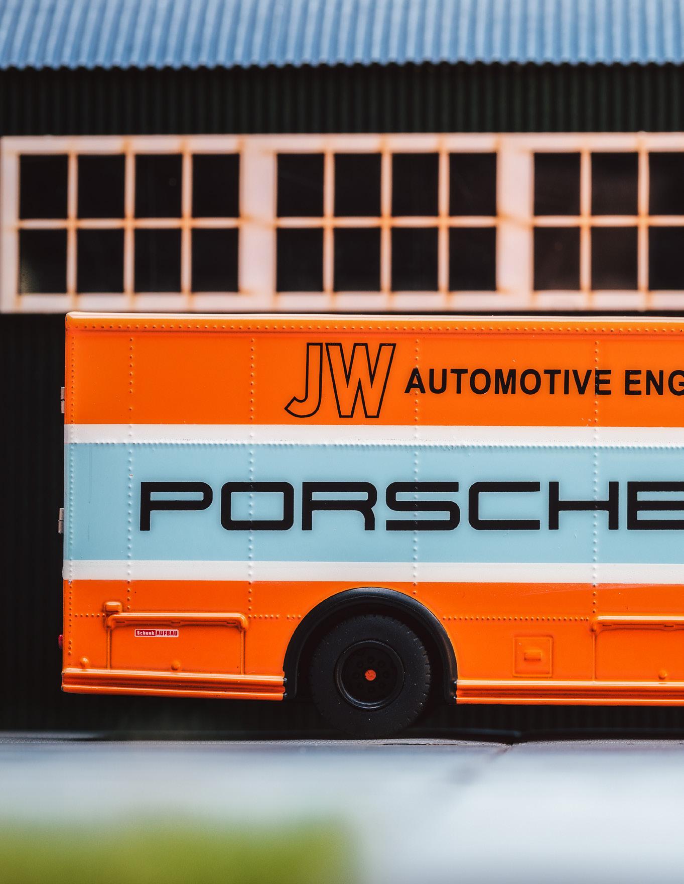 The model is based on the Mercedes Bens O317 underfloor engine bus. The chassis was converted by Robert Schenk, a Stuttgart company to carry extra cars, engines and spare parts of the Porsche Gulf Racing team.