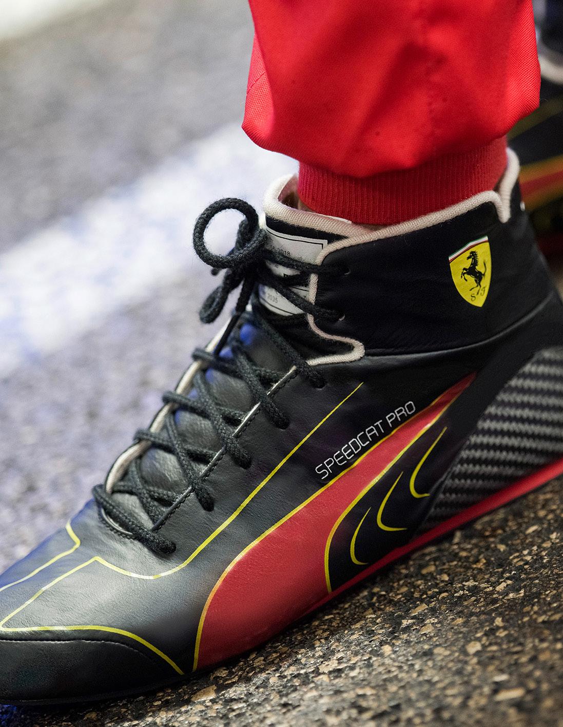 Refined through years of innovation, and packed with Grand Prix technology, the Scuderia Ferrari Speedcat Pro represents the very leading edge of performance driver footwear. Constructed of FIA specification materials designed for speed, comfort, and fire protection, the Scuderia Ferrari Speedcat Pro guarantees absolute control for the wearer while in the cockpit.