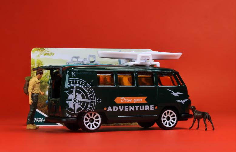 This good-looking fellow has a fantastic colour combination of British Racing Green and Orange tinted windows and lights. Stacked up against the other KOMBI vans from Majorette, this is the hottest colour combo. Comes with a canoe, a nice little compass paint job on the rear which opens and nice bright white adventurous wheels.