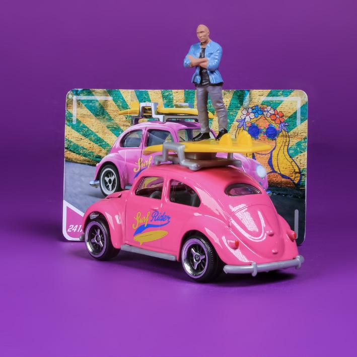 Surf rider is a cool pink-like lemonade Beetle body and light grey plastic bits complete with a roof rack for holding the yellow surfing board that comes with it. Majorette has done a number of these Beetle VWs and they have perfected getting it right, The front bonnet opens and the surfboard is detachable.