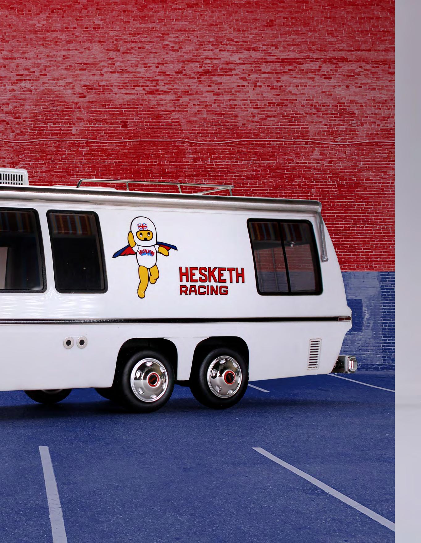AUTOMODELLO PROVIDED US WITH A LIST OF GMC MOTORHOMES TO CHOOSE FROM. THEY CURRENTLY OFFER TWO ORIGINAL MANUFACTURER-SPECIFIC COLOURS: THE GLACIER WHITE AND BLUE COMBINATION AND THE PALM GREEN VERSION, WHICH CAUGHT MY EYE. HOWEVER, THE THIRD OPTION ON THE LIST TRULY DELIGHTED ME, SO WE REQUESTED THE HESKETH RACING MODEL!