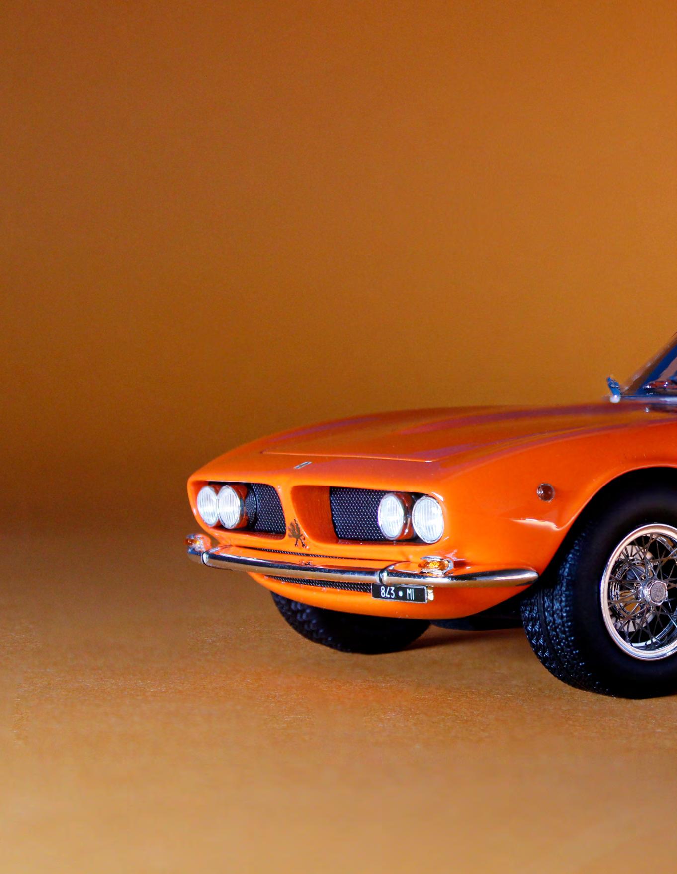 The car’s badging features elegantly metal-etched elements that are perfectly positioned, and the wheels are stunningly accurate replicas of traditional "wire" wheels, avoiding any cheap chrome alternatives. Additionally, each color has a separate limited production run. For instance, the Orange Iso Grifo has only 49 models produced, while the Black version is even rarer, with just 6 units made. This limited production significantly enhances the long-term value of the model in your collection.