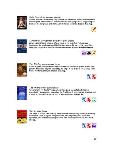 Suite Scarlett by Maureen Johnson Scarlett inherits a suite in her zany family’s old Manhattan hotel—and the care of the occupant. Her adventures include assisting this aging actress, supporting her brother’s theater group, and starting an ill-starred romance. Grades 8 and up.