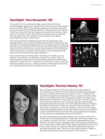 Spotlight: Tara Desautels ’89 In recognition of an outstanding legal career, Governor Arnold Schwarzenegger appointed Tara Desautels ’89 to the Alameda Superior Court on April 8, 2010. At her official swearing-in ceremony, Alameda County Assistant Public Defender Brendon Woods said that he learned more from Tara when they were opposing counsel than he had in three years of law school. Tara’s proud family, including her sister Chanelle ’93, was present for the ceremony. Tara’s husband, Colin Kemp, presented her with her judicial robe. The Honorable Tara M. Desautels served almost eight years as an Alameda Deputy District Attorney after graduating from the University of California, Hastings College of the Law. As a Deputy District Attorney Tara served as a member of the Child Sexual Assault felony prosecution team and was selected to be a Sexual Assault Mentor for the California District Attorney’s Association and a liaison to the multijurisdictional Sexual Assault Felony Enforcement taskforce. Tara joined Pillsbury Winthrop Shaw Pittman LLP in 2005 as a civil litigator. According to Jim Rishwain, Pillsbury Firm Chair, Tara “is a highly polished litigator who has always had a deep commitment and passion for public service.” In addition to working with clients, Tara has devoted countless hours as a Board member and President of CALICO, a non-profit Alameda County children’s advocacy center.