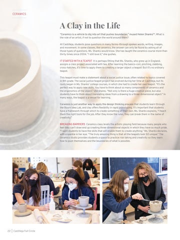 A Clay in the Life “Ceramics is a vehicle to dig into art that pushes boundaries,” mused Helen ShanksHA. What is the role of an artist, if not to question the world around them? At Castilleja, students pose questions in many forms—through spoken words, writing, images, and movement. In some classes, like ceramics, the answer can only be found by asking all of those types of questions. Ms. Shanks would know. She has taught the ceramics course more than thirty times since 2004. “I still love it,” she gushes. IT STARTED WITH A TEAPOT It is perhaps fitting that Ms. Shanks, who grew up in England, assigns a class project associated with tea. After learning the basics—coil, pinching, slabbing, cross-hatches, it’s time to apply them to creating a larger object: a teapot! But it’s no ordinary teapot. This teapot must make a statement about a social justice issue, often related to topics covered in 8th grade. The social justice teapot project has evolved during her time at Castilleja, but its roots began in Ms. Shanks’ college courses, in which she had to create her own teapot. “It’s the perfect way to apply new skills. You have to think about so many components of ceramics and the ergonomics of the object,” she shares. “Not only is there a huge creative piece, but also students have to think about translating ideas from a drawing to a three-dimensional object.” In many ways, the teapot is a vessel for learning. Ceramics is just another way to apply the design thinking process that students learn through the Bourn Idea Lab, and clay offers flexibility in rapid prototyping. It’s important that students have a framework through which to create something of their own. Ms. Shanks explains, “I teach them the right tools for the job. After they know the rules, they can break them in the name of creativity.” BREAKING BARRIERS Ceramics class levels the artistic playing field because many people who feel they can’t draw end up creating three-dimensional objects in which they have so much pride. “I want students to have the skills that will enable them to create anything,” Ms. Shanks declares, with a sparkle in her eye. “The truly amazing thing is that all the teapots look SO unique.” The ceramics studio provides students a space to practice risk taking and creativity so they learn how to push themselves and the boundaries of what is possible.