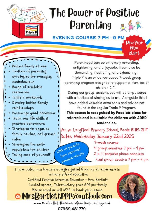 Triple P Parenting Programmes will be running in the evenings at Longfleet Primary School in Poole. If you are interested in exploring new parenting strategies or considering a paediatric referral, please do click on the image for more information.