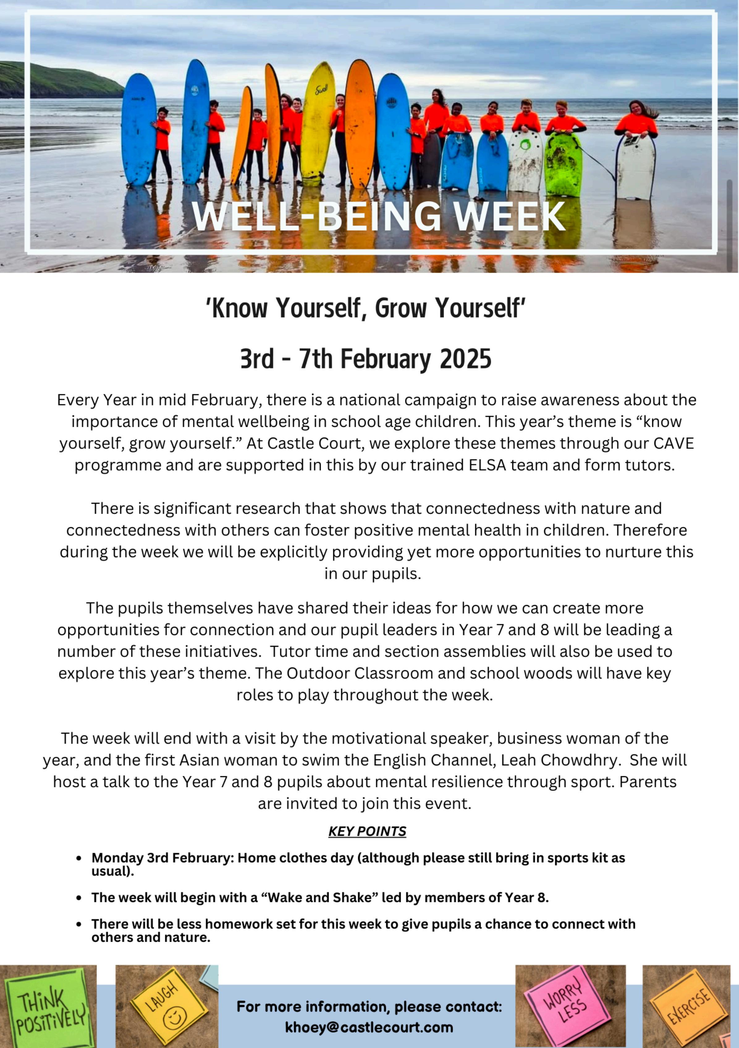 Next week, we will be raising awareness of Children’s Well-being through the theme of ‘Know Yourself, Grow Yourself.’ There will be a range of activities on offer throughout the week including hot chocolate at break times, mindfulness, campfires and walks in nature. On Thursday at 2:15pm, there is also the opportunity for parents to listen to the inspirational Leah Chowdhry who was the first British Asian woman to swim the English Channel and was awarded The British Citizenship Medal and Women of the Year by the London Asian Business Awards. I hope that as many of you as possible will be able to join us for what I’m sure will be a fascinating talk. Our Well-being Week will start on Monday with pupils being able to come to school in comfy clothes and our now famous whole school Wake and Shake led expertly by our Year 8s. I better go and practise my Irish Dancing moves!