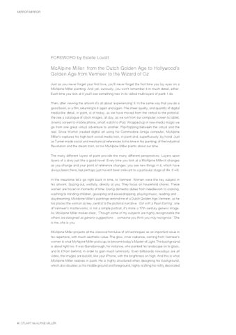 McAlpine Miller: from the Dutch Golden Age to Hollywoodâs Golden Age from Vermeer to the Wizard of Oz Just as you never forget your first love, youâll never forget the first time you lay eyes on a McAlpine Miller painting. And yet, curiously, you wonât remember it in much detail, either. Each time you look at it youâll see something new in its veiled multi-layers of paint. I do. Then, after viewing the artwork itâs all about âexperiencingâ it. In the same way that you do a good book, or a film, returning to it again and again. The sheer quality, and quantity of digital media-like detail, in paint, is of today, as we have moved from the verbal to the pictorial. We see a catalogue of stock images, all day, as we run from our computer screen to tablet, cinema screen to mobile phone, smart watch to iPad. Wrapped up in new-media magic we go from one great virtual adventure to another. Flip-flopping between the virtual and the real. Since Warhol created digital art using his Commodore Amiga computer, McAlpine Millerâs captures his high-tech social-media look, in paint and, superfluously, by hand. Just as Turner made social and mechanical references to his time in his painting, of the Industrial Revolution and the steam train, so too McAlpine Miller paints about our time. The many different layers of paint provide the many different perspectives. Layers upon layers of a story just like a good novel. Every time you look at a McAlpine Miller it changes as you change and your point of reference changes; you see new things in it, which have always been there, but perhaps just havenât been relevant to a particular stage of life. It will. In the meantime letâs go right back in time, to Vermeer. Women were the key subject in his artwork. Gazing out, wistfully, directly at you. They focus on household chores. These women are frozen in moments of time. Doing domestic duties from needlework to cooking, washing to minding children, gossiping and eavesdropping, playing music, reading and ... daydreaming. McAlpine Millerâs paintings remind me of a Dutch Golden Age Vermeer, as he too places the woman as key, central to the pictorial narrative. âGirl with a Pearl Earringâ, one of Vermeerâs masterworks, is not a simple portrait, itâs more a 17th century generic image. As McAlpine Miller makes clear, âThough some of my subjects are highly recognisable the others are designed as generic suggestionsâŠ.someone you think you may recognise.â She is me, she is you. McAlpine Miller projects all the classical formulae of art techniques as an important issue in his repertoire, with much aesthetic value. The glow, inner radiance, coming from Vermeerâs women is what McAlpine Miller picks up, to become todayâs Master of Light. The background is about light too. It was Gainsborough, for instance, who painted his landscape on to glass, and lit it from behind, in order to gain much luminosity. Even billboards nowadays are all video, the images are backlit, like your iPhone, with the brightness on high. And this is what McAlpine Miller realises in paint. He is highly structured when designing his background, which also doubles as his middle ground and foreground, highly crafting his richly decorated