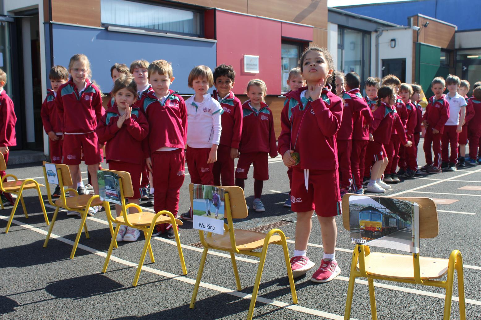 The Junior Infants children are covering the topic of 'Data' in their maths lesson, and this morning they collected data about how they travelled to school They did this by lining up behindchairswhichrepresentedthedifferentmodesoftransport.Theresultswere: