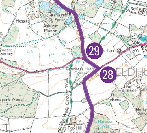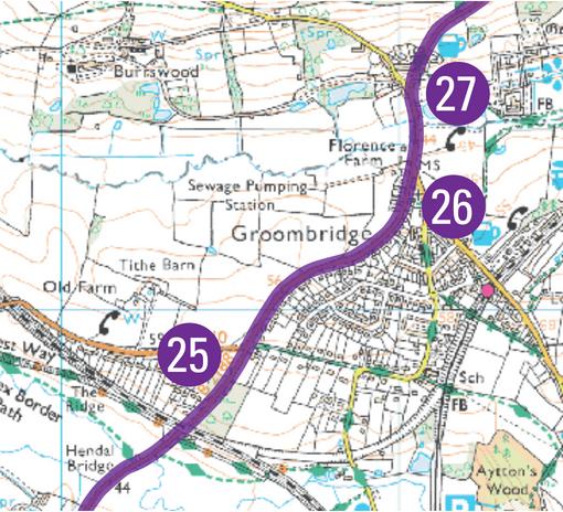 Point 25 is a right hand turn at a junction after a small climb that passes under a railway bridge. It will be traffic controlled with STOP/ GO boards but please exercise caution turning onto the Withyham Road. Point 26 is a mini roundabout. Please take care as you approach, particularly as traffic joining from your right may be hidden.