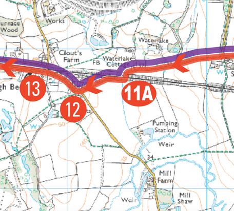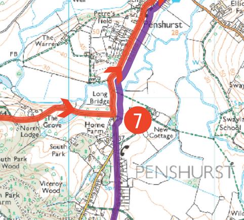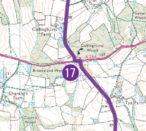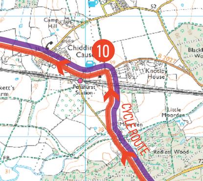 This is an offset cross-roads where you will turn left initially, cycle for 30 yards and then turn right across the busy A264. The road will be traffic controlled with STOP/ GO signs but please be vigilant as this is a fast piece of a road.