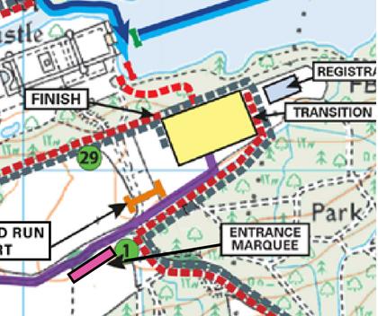 Cross over a tarmac road by some ticket huts and you will see the main event village in front of you Watch out at the various pedestrian crossing points as you circumnavigate transition passing the finish chute off to your right. Next time around you will be the one crossing the line!