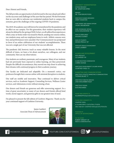 Dear Alumni and Friends, The fall provides an opportunity to look forward to the year ahead and reflect on the successes and challenges of the year that has passed. We feel fortunate that we were able to welcome our residential students back to campus this semester, given the challenges of the ongoing COVID-19 pandemic. The 2019-20 academic year will forever be remembered for the pandemic and its effect on our campus. For this generation, their student experience will always be defined by the spring of 2020. In fact, we all suffered lost experiences when a stay-at-home order was issued in March, sending our courses online, our students away, and our employees home to work. Athletic seasons were lost, and performances were canceled. Our Commencement was postponed in favor of an online celebration of our students’ accomplishments. There was not a single part of our University that was not affected. The pandemic did, however, teach us many valuable lessons. In the most difficult of times, we learn a lot about ourselves, our colleagues, and our community. Here are my observations: Our students are resilient, passionate, and courageous. Many of our students had not previously been exposed to online learning, yet they persevered. Despite the difficult circumstances, they moved one step closer to achieving their dreams with continued progress in their academic journey. Our faculty are dedicated and adaptable. On a moment’s notice, our professors brought their courses online with minimal disruption to students. Our staff are nimble and innovative. They continued to deliver critical services, such as Academic Support, Counseling Services, Wellness Center services, and Admissions events without missing a beat. Our donors and friends are generous and offer unwavering support. In a time of great uncertainty so many of our donors and friends offered kind words, moral support, and generous gifts in our greatest time of need. I’m pleased to present the fall edition of Castleton Magazine. Thank you for your continued support of Castleton University.