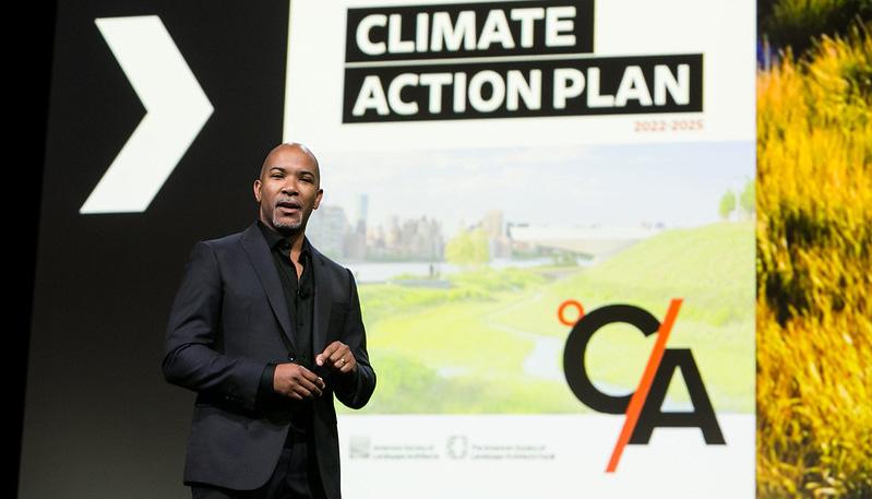 ASLA is empowering our members to design a sustainable and equitable world through landscape architecture.ABOVE (clockwise from top): ASLA Climate Action Plan Task Force members (left to right) Pamela Conrad, ASLA, José Almiñana, FASLA, Diane Jones Allen, FASLA, and Sarah Fitzgerald, ASLA; Vaughn Rinner, FASLA, presents the Climate Action Plan; Q&A during the Climate Action Plan education session. Photos by Korey Davis Photography.