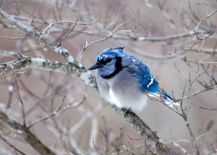 Later February often brings ice. This bluejay (right) doesn’t look too pleased to have sleet on top of his head, but he still looks pretty handsome.