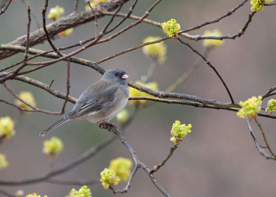 In warmer years, the sassafras trees (above) can be seen blooming in the middle of March. This dark eyed Junco hadn’t yet left to go north for the summer.