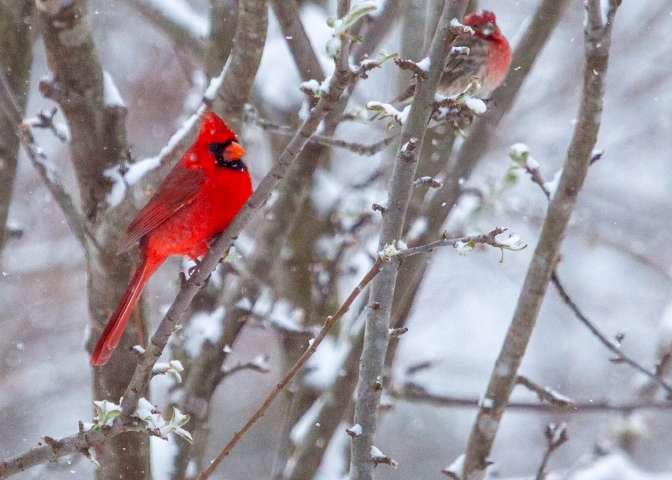 Lighter flurry showers are more common during early February and create a peaceful backdrop for viewing birds like these female cardinals. They really show off their subtle coloring against the grays of winter.