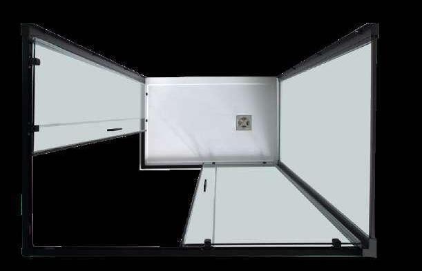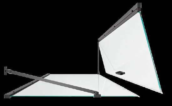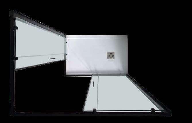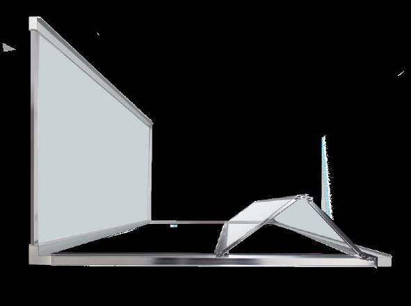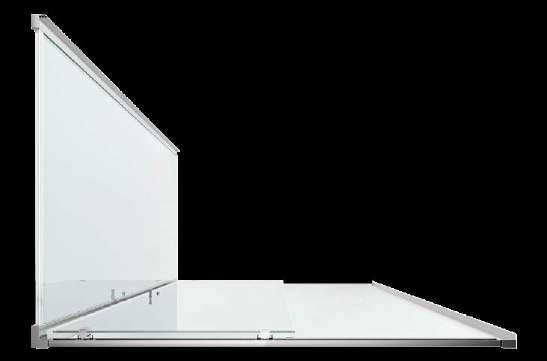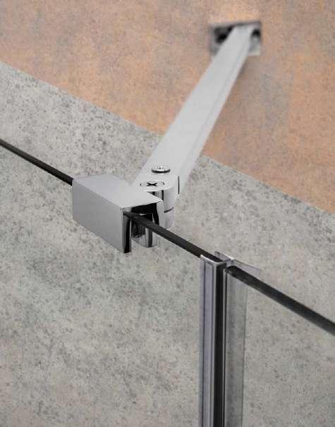 Il telaio a parete assicura stabilità e sorregge lo spessore del vetro fisso da 8 mm che, grazie a due cerniere tecniche, resta libero dal profilo.