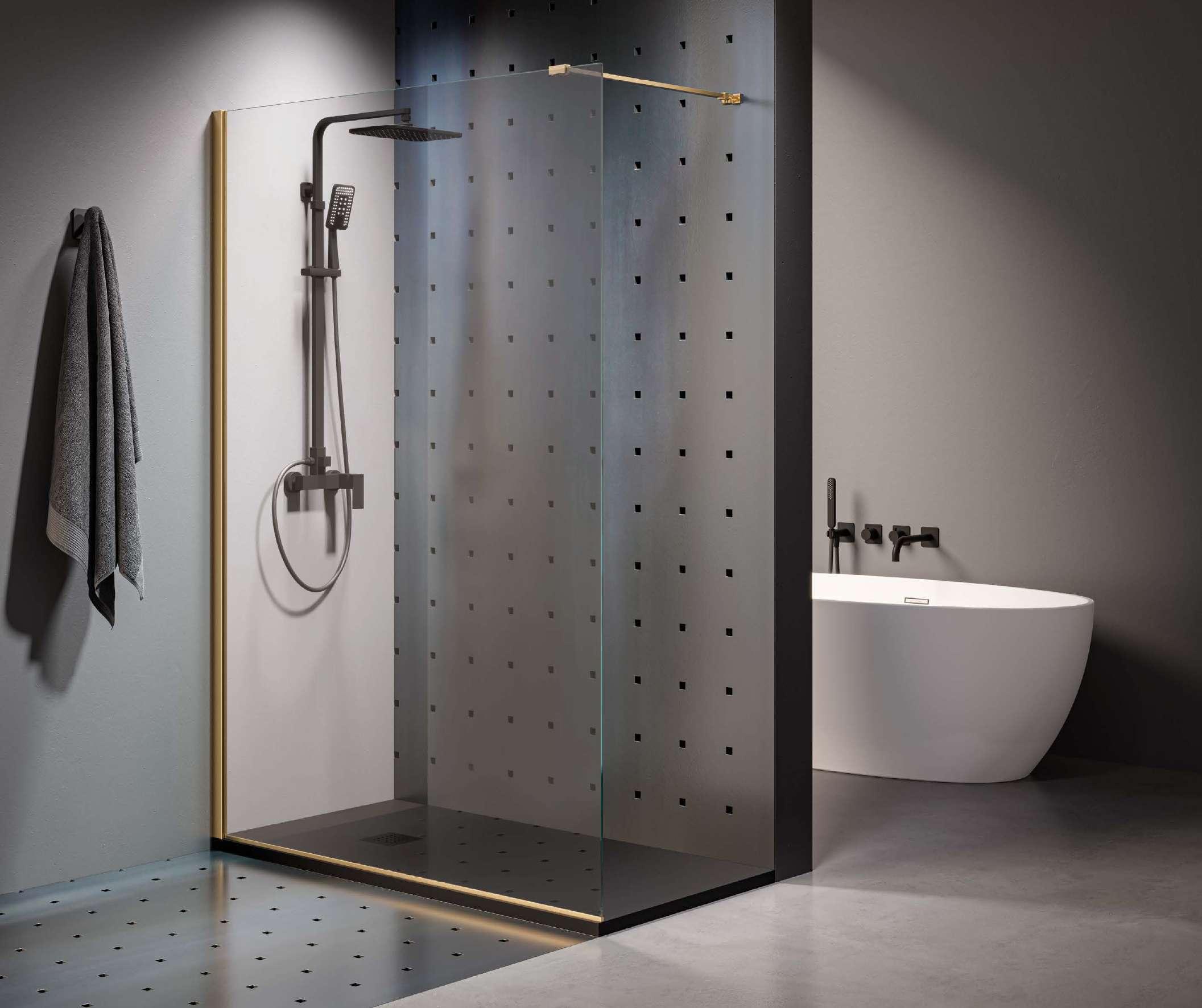 Il profilo oro crea un interessante accento cromatico e illumina con discrezione i contorni del box doccia.