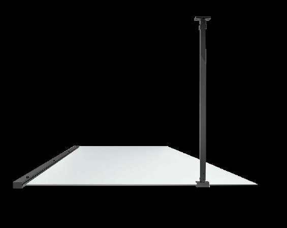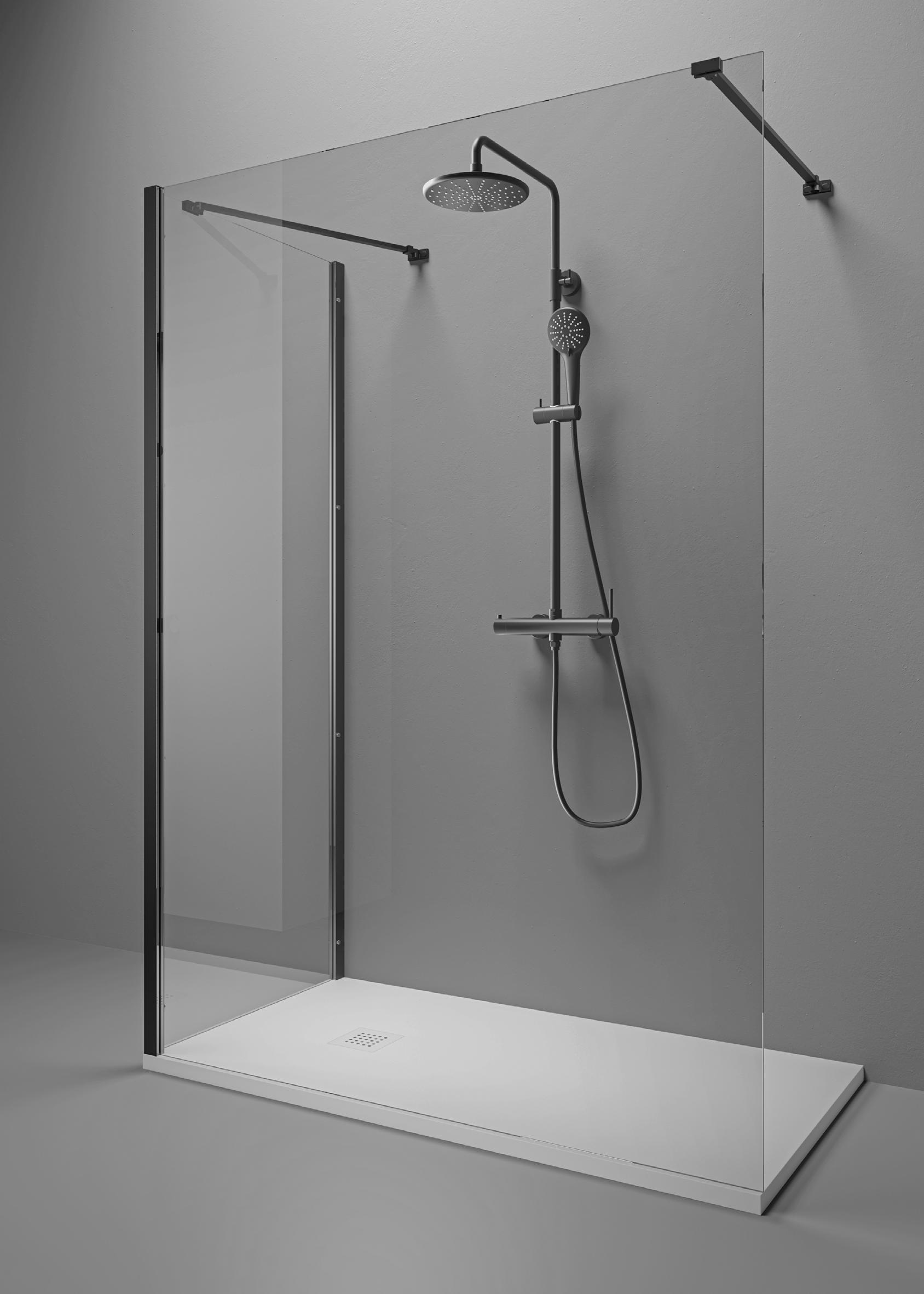 The frame, fixed to the wall, guarantees stability and supports the 8 mm fixed glass panel, that thanks to the two technical hinges, is frameless.