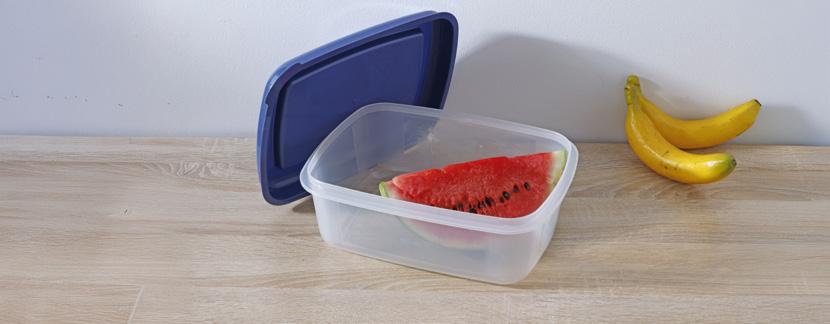 Botella con cierre de rosca y recipientes con cierre a presión • Plástico • Transparente con verde y azul • 2 recipientes de 14 x 14 x 6 cm (500 ml) • 4 utensilios de 15 cm • 2 botellas de 8 x 8 x 13 cm (500 ml)