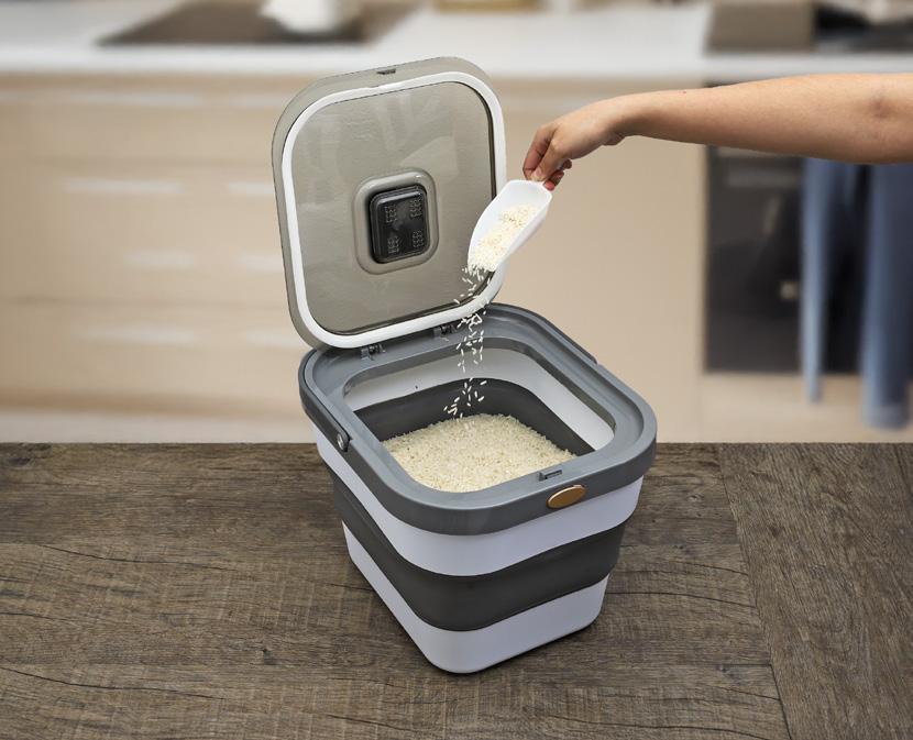 Con tapón en la base para drenar • Para almacenar arroz, frijoles, maíz, alimento de mascota, jabón en polvo y más • Blanco con gris