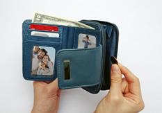 Cierre principal con broche • Con múltiples compartimentos para tarjetas, billetes y monedero • Beige con azul petróleo • 10 cm de ancho x 13 cm de largo • Imitación de cuero
